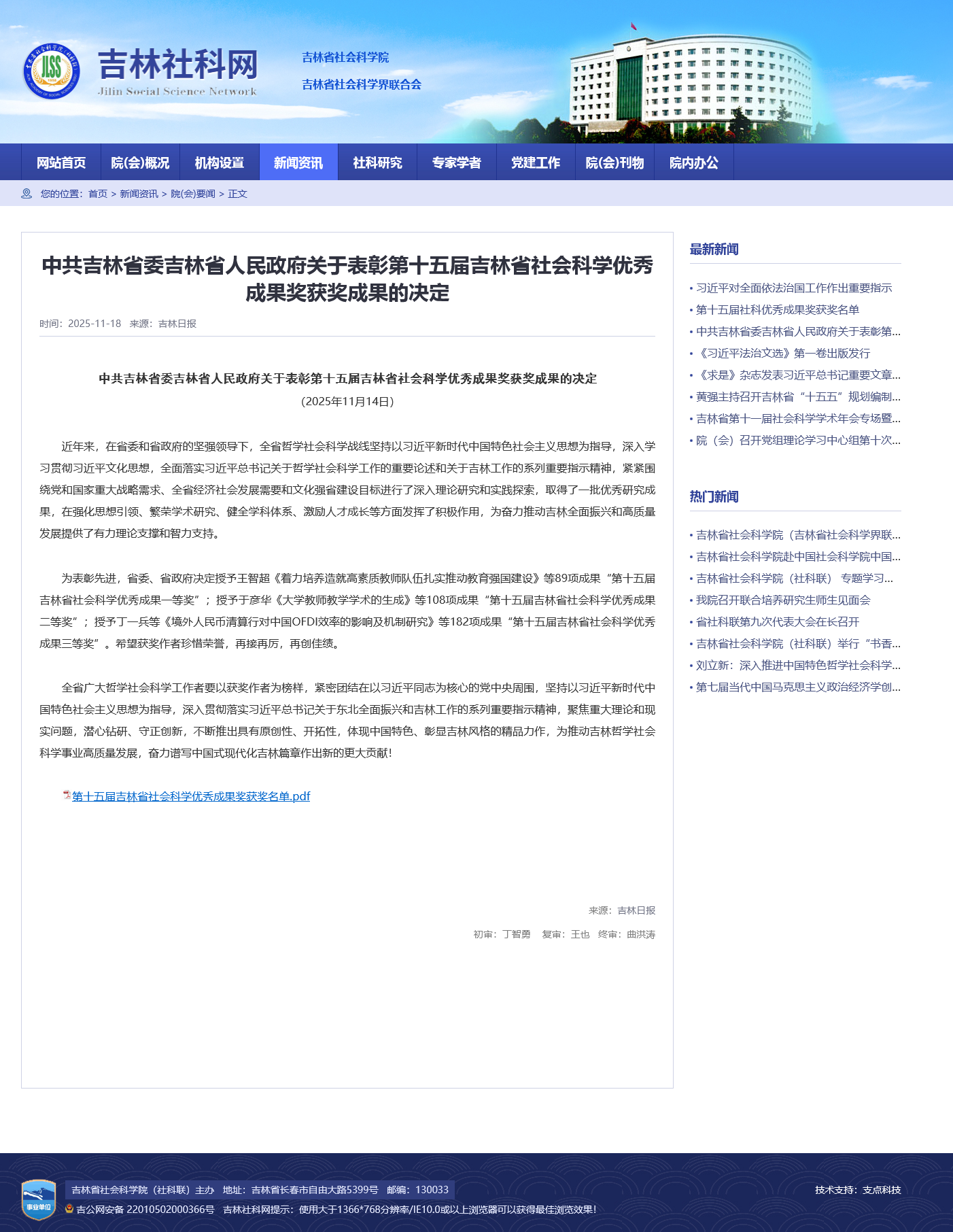 近日,中共吉林省委、吉林省人民政府发布《中共吉林省委吉林省人民政府关于表彰第十五届吉林省社会科学优秀成果奖获奖成果的决定》,极速赛车