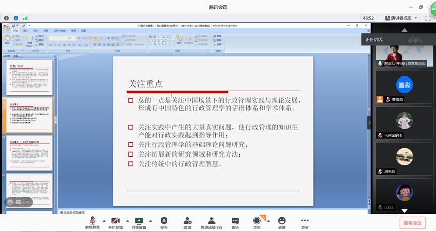 主办的教师科研水平助力计划第12期活动在腾讯会议室线上举行。本次讲座邀请到中国行政管理学会副秘书长、研究员、《中国行政管理》杂志主编解亚红担任主讲嘉宾。主讲题目为:“《中国行政管理》:我们需要怎样的论文”。极速赛车