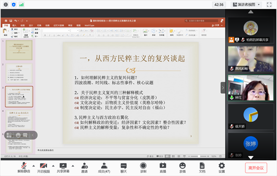 刘畅教授在评议环节中总结了此次讲座的主要内容,表示林红教授的讲解既有深度的分析,又有广阔的视野,并再次感谢林红教授的分享。在问答互动环节,同学们与林红教授就民粹主义与身份政治研究的问题与困惑做了进一步交流,讲座在热烈的交流探讨中圆满结束。