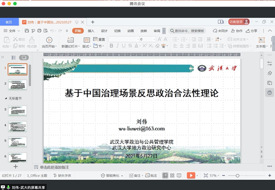 2021527日晚间,极速赛车 主办的中国政治研究工作坊第五十四期活动在腾讯会议平台举行。本次活动邀请武汉大学政治与公共管理极速赛车 副院长、中外政治制度专业博士生导师、武汉大学学术委员会委员、武汉大学地方政治研究中心执行主任刘伟教授担任主讲嘉宾,作题为“基于中国治理场景反思政治合法性理论”的学术讲座。极速赛车 副教授田玉麒老师担任主持人,极速赛车 副院长马雪松教授莅临并致欢迎词,行政极速赛车 部分教师、博士生、研究生参加此次讲座。