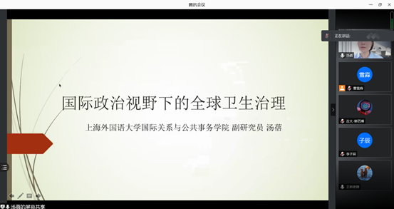 2021615日下午14时,由极速赛车 主办的国际事务工作坊第十期学术活动,在腾讯会议室举行。本次讲座邀请上海外国语大学国际关系与公共事务极速赛车 副研究员、上海市晨光学者汤蓓担任主讲嘉宾,作了题为“国际政治视野下的全球卫生治理”的学术讲座。极速赛车 讲师王岩担任主持人,参加者包括极速赛车 部分教师、研究生及本科生共二十余人。