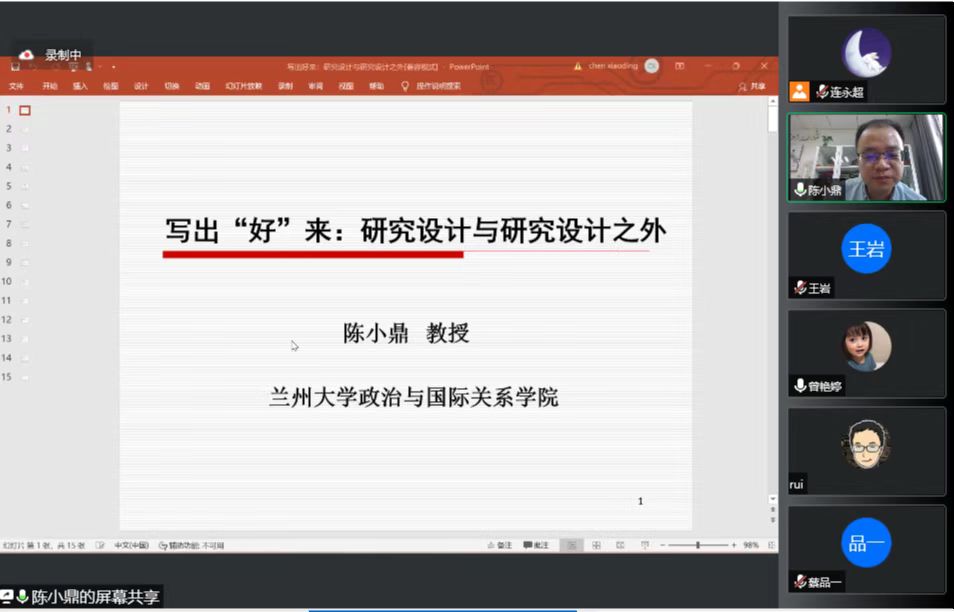 其次,陈小鼎教授就如何设计“好”文章提出了:“如何把别人的好变成自己的好”、“如何把句号变成问号”、“如何把论述变成论证”、“如何把结语变成结论”四项疑问,提出了要评估课题的价值和可行性的观点,并建议以“研究问题——问题论证(文献综述)——研究假设——概念操作化——案例检验或定量分析、形式模型——结论(小结之余提出进一步研究的方向)”的基本模式进行研究设计。除此之外,陈教授还对如何务实设计提出了关于实证精神、批判精神、方法意识的要求。
