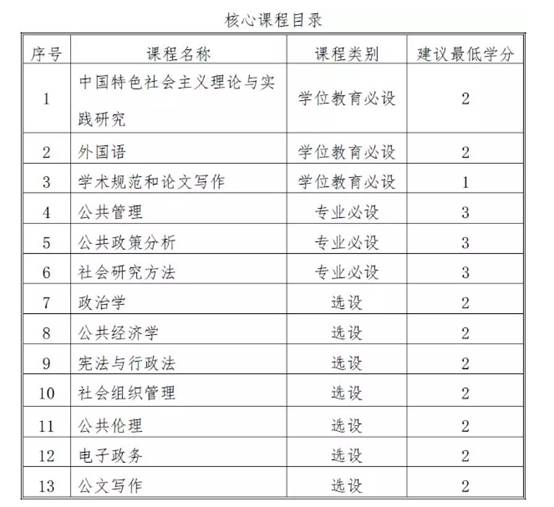 1.核心课是学生必修课程。“核心课程目录”共列13门课,其中,“中国特色社会主义理论与实践研究”、“外国语”和“学术规范和论文写作”为学位教育必设课程; “公共管理”、“公共政策分析”和“社会研究方法”是本专业必设核心课程;其他核心课程,由各培养院校从“核心课程目录”中选择开设。