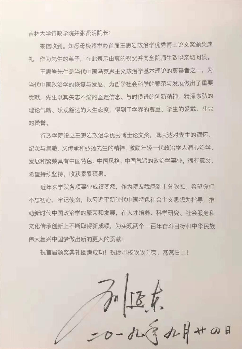 杰出院友、王惠岩先生的弟子,原中共中央政治局委员、国务院副总理刘延东同志为此次颁奖典礼发来的信件,她由衷祝贺王惠岩政治学优秀博士论文奖颁奖典礼并向全院师生致以亲切问候。刘延东同志在信件中对王惠岩先生表达了缅怀,并勉励全院师生不忘初心,牢记使命,以习近平新时代中国特色社会主义思想为指导,为新时代中国政治学的繁荣和发展,在人才培养、科学研究、社会服务和文化传承创新上不断取得新成绩,为实现两个一百年奋斗目标和中华民族伟大复兴中国梦做出新的更大的贡献。