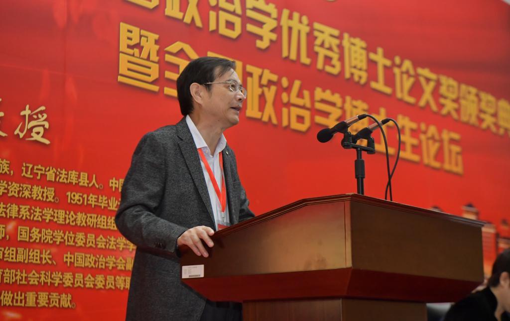 国务院学位委员会政治学学科评议组召集人徐勇教授致辞。他在致辞中充分肯定了设立王惠岩政治学优秀博士论文奖的特殊意义,认为本次奖项设置具有学科“国优”的开创性,以王惠岩先生命名具有极大的象征性和标志性,对于获奖者以及全体政治学人而言是无上的荣光。同时,他从中国政治学的学科建设出发,认为此次博士论文奖的评选体现了政治学人抓住了时代转变的历史机遇期,标志着中国政治学发展由大到优的发展与转变。