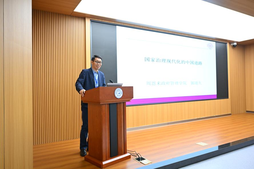 教授薛洁担任主持人。郭道久在国家治理现代化的背景下,对中国特色社会主义治理体系进行了深入剖析。他强调了人民中心的方法论与党的领导核心地位的本质特征,并指出要充分发挥国家与社会的积极性。在此基础上,郭道久创新性地提出了常态与弹性治理的双轮驱动治理模式,为我国治理体系和治理能力现代化提供了新的思路和方向。