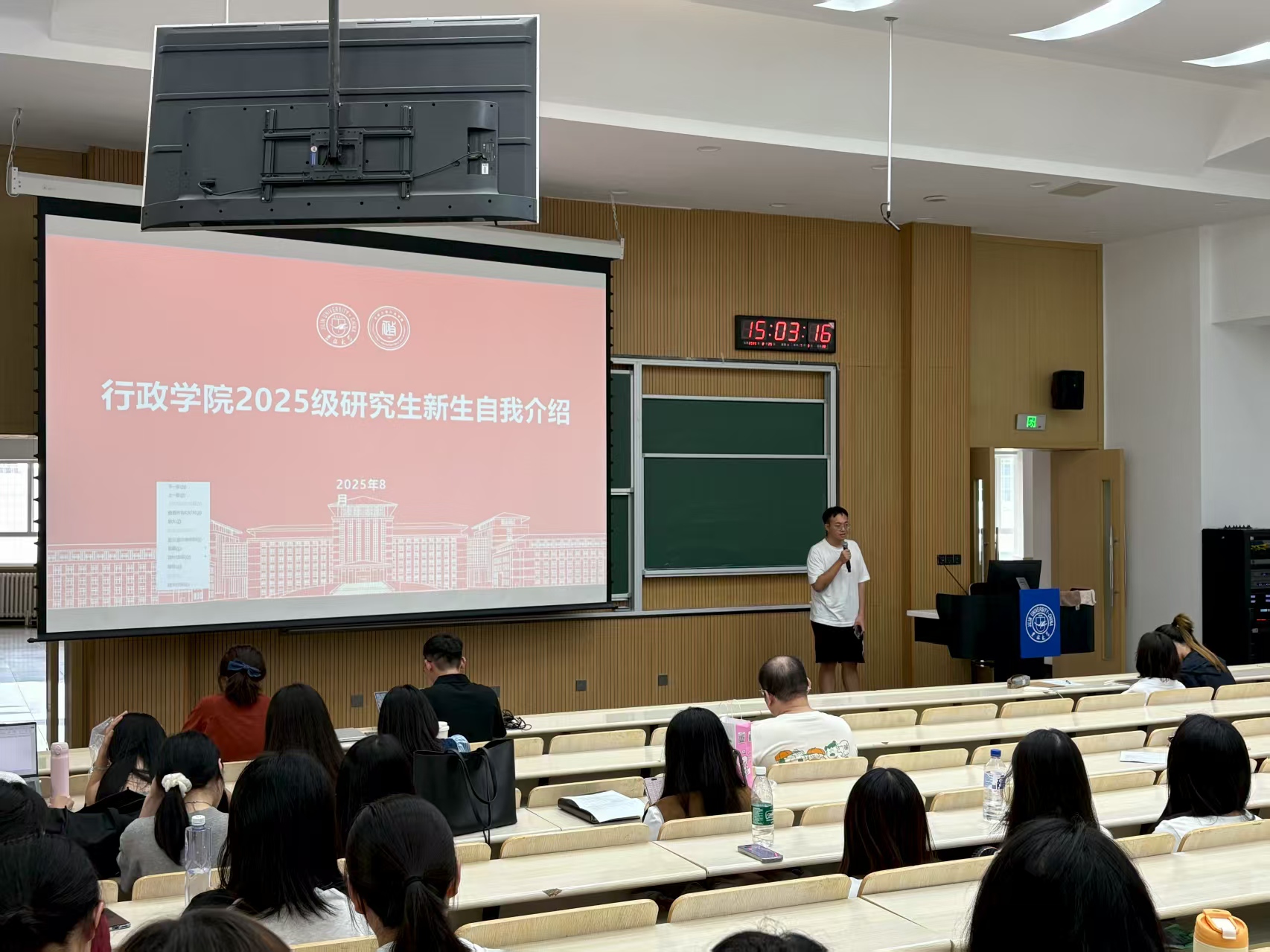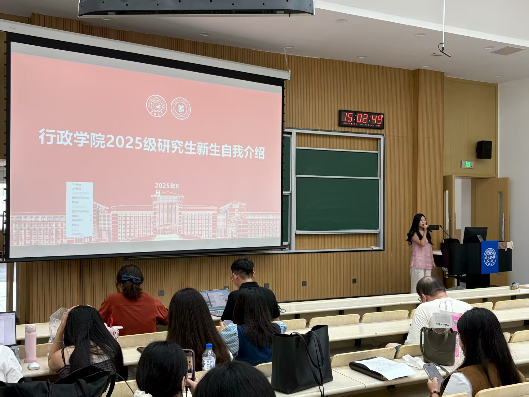 于逸夫教学楼第十五阶梯教室举行2025级研究生新生见面会活动,研究生办公室主任高琛、研究生教学秘书宋佳晖、研究生辅导员孙月及2025级全体研究生新生共同参与。