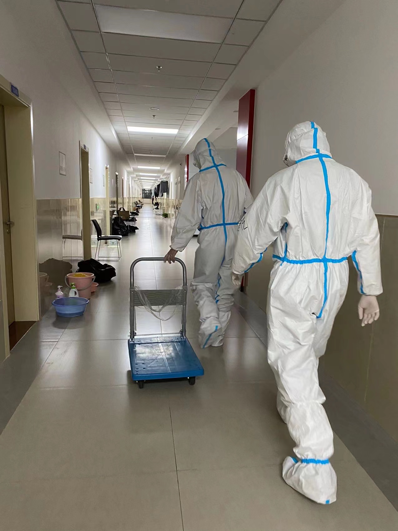 的学生,很多人我并不认识,但是我喜欢叫他们“大白”和“小蓝”,一个原因是因为每天的“大白”和“小蓝”都不是同一个人,这样叫他们我可以更好地分清楚即将要去做什么工作,“大白”总带着我去给同学们送一日三餐、送防疫物资和其他东西,“小蓝”会带着我去收拾大家做完核酸抗原自测的试剂盒、收拾大家的餐后垃圾。另一个原因是因为他们工作时认真的样子,让我觉得他们就是逆行路上最可爱的人。工作的20天里,我逐渐也适应了自己的工作,在早上6:30左右调整好自己等着“大白”接我一起去分早餐、在中午12:00左右一起去拿午餐、在晚上6:00时去给同学们送晚餐,偶尔因为特殊原因,饭菜会晚到一会,但是“大白”和我都会提前准备好,只要一有消息就马上投入工作,争取及时让同学们吃上饭。每次餐后一小时,“小蓝”就会带着我去收垃圾。当然有些工作我也没有办法去提前准备,有时候早上8:00刚刚收拾完垃圾歇下来,就被带去送饮用水了,有时候半夜1:00也得爬起来去搬口罩、消毒液等防疫物资。给同学们送物资的这20天里,我已经记下了每个人的宿舍,这条路线也记得清清楚楚,经常能听到很多同学们说,一听到我走路时发出的声音,就知道是“大白”和“小蓝”来送餐和其他防疫物资了,我还有点小骄傲。作为铁打的我在前不久崴了“脚”,一个车轱辘差点磨掉,“大白”和“小蓝”他们每天都要和我做一样的事情,我想他们的脚肯定也会很不舒服吧,但是我从来没听到他们抱怨过,我听见的只有他们一起喊着“一二”用力搬东西的声音。送物资的时候,我也经常会遇到上门做核酸的医护人员和陪同的志愿者,看着他们护目镜上的雾气,我能想象到他们的辛苦与付出。在抗击新冠疫情阻击战中,每个人的意志都刚强如铁,我只是一块铁板车,而这些医护人员、志愿者却如同一个个“铁人”。