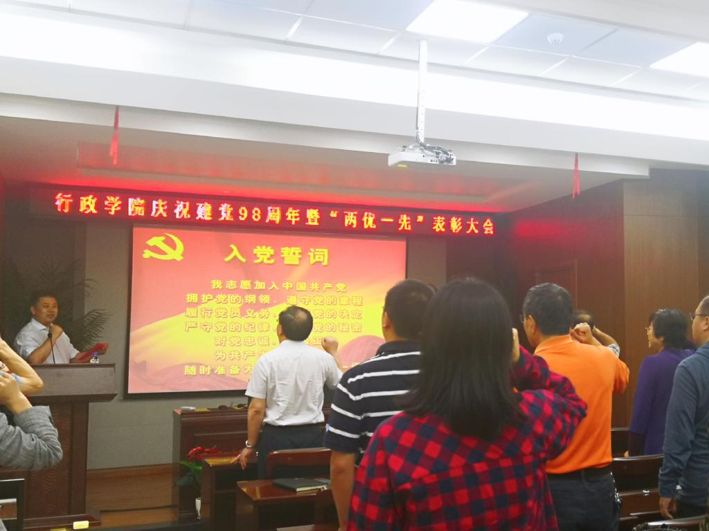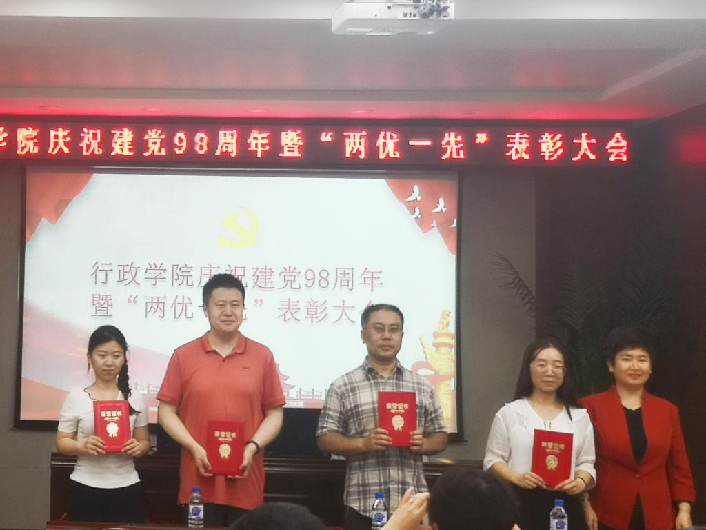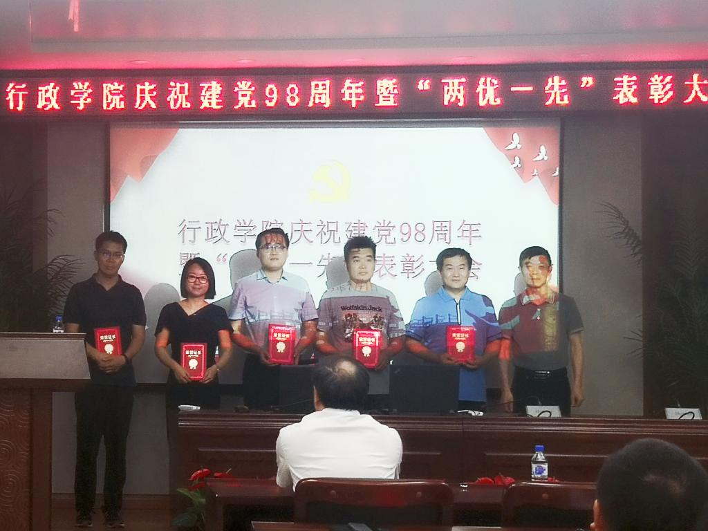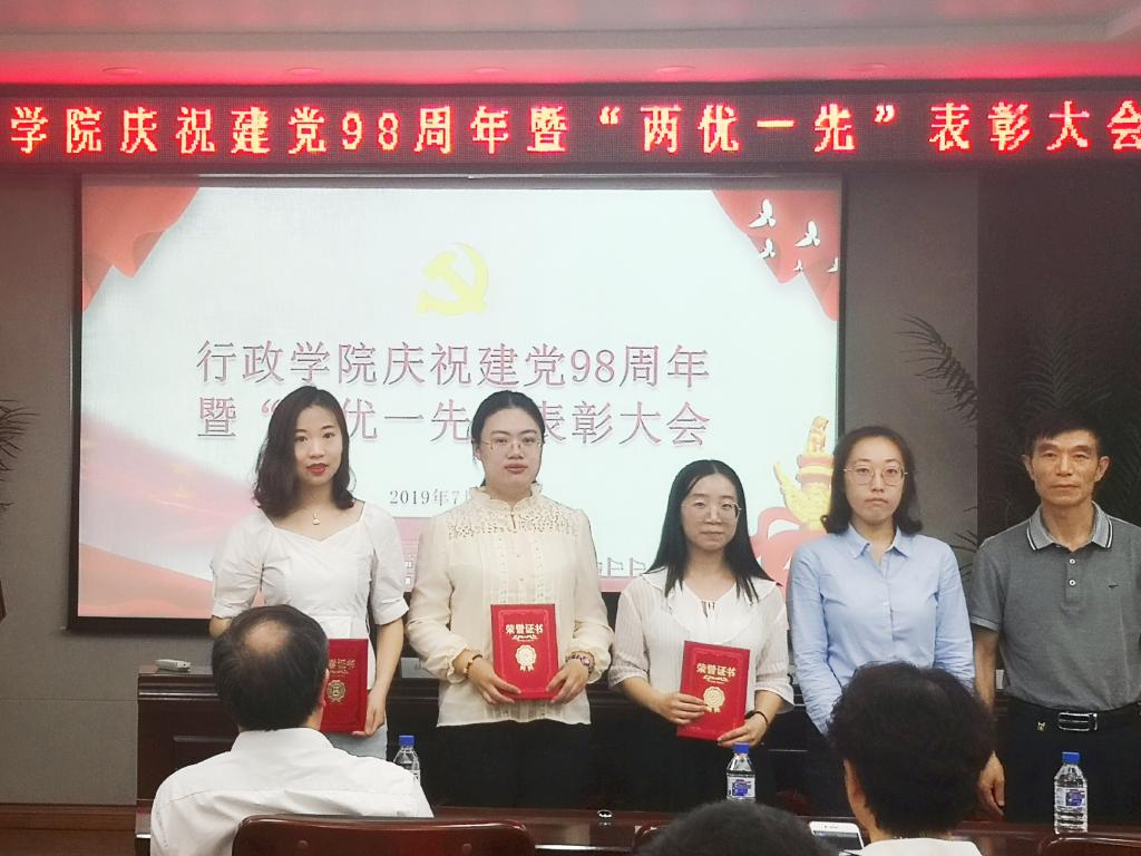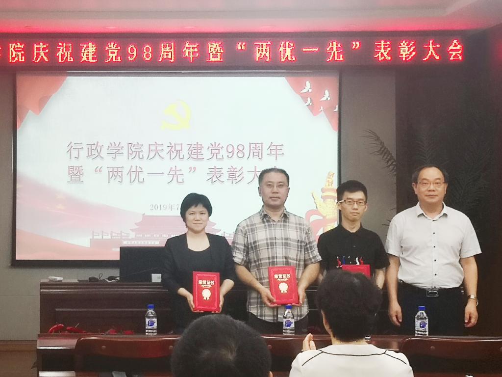 党委2019年“两优一先”表彰决定》,党委副书记常有余、院长张贤明、党委书记魏鹤影分别为获得表彰的优秀共产党员、优秀党务工作者、先进党支部颁发荣誉证书。优秀党务工作者代表王庆华教授、学生优秀党员代表陈希分别进行了发言。