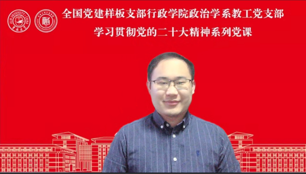支部书记刘畅阐述了“学习贯彻党的二十大精神系列党课”的目的和意义,指出政治学系教工党支部将组织党员教师从专业视角和学理层面阐释党的二十大精神,并通过支部共建和专题党课的活动形式,使政治学系师生党员领悟和贯彻党的二十大精神。