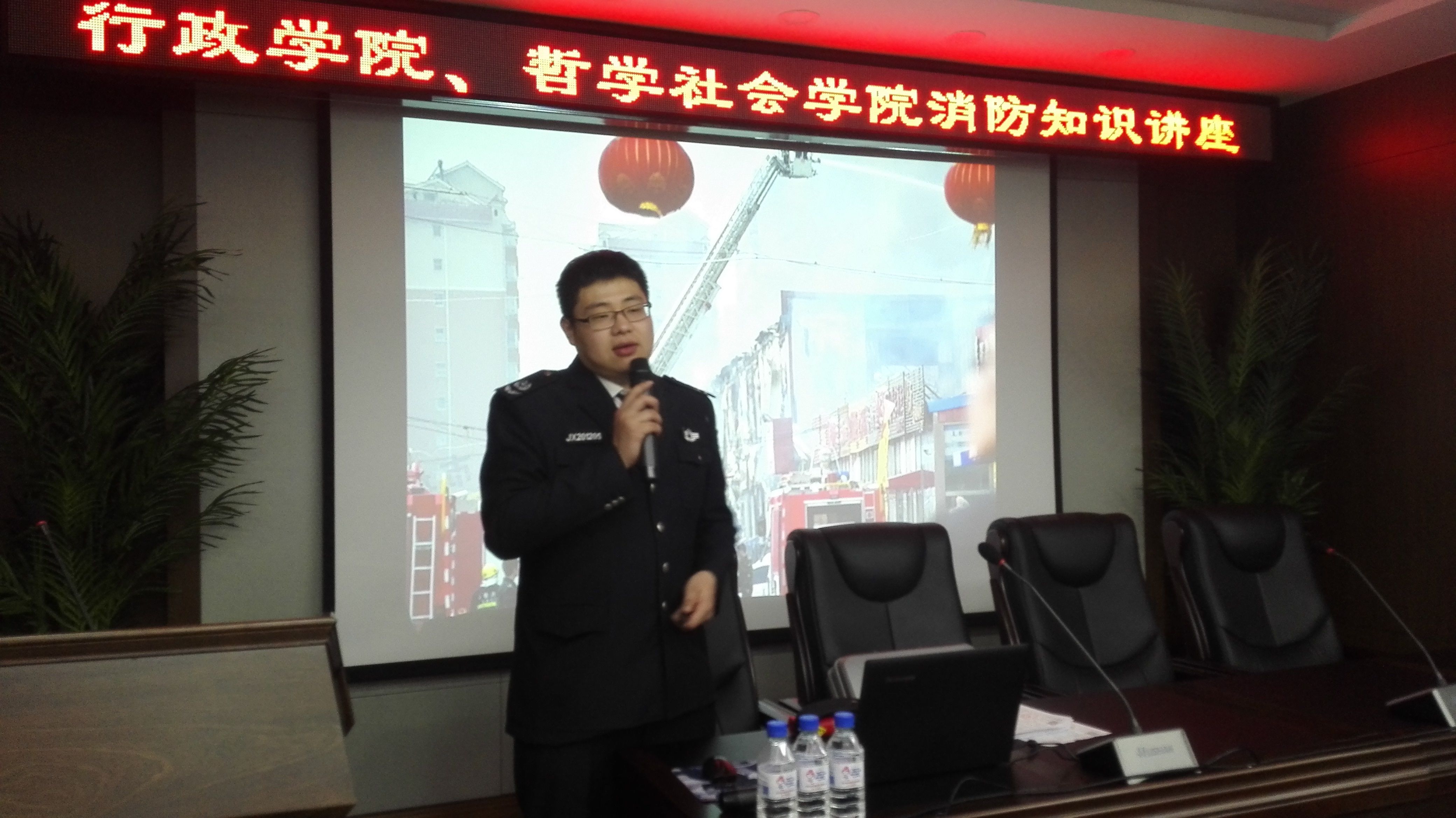 本次讲座邀请的是吉林省安家消防知识服务中心翟浩教官,翟教官结合近年发生的典型火灾实例,介绍了常见火灾发生的类型、发生的起因、扑救的基本方法等,并指出我们日常生活中在使用电器、燃气方面存在的认识误区。翟教官在讲课中,图文并茂、生动幽默,他用触目惊心的火灾案例给我们上了一次生动的消防知识专题讲座课。