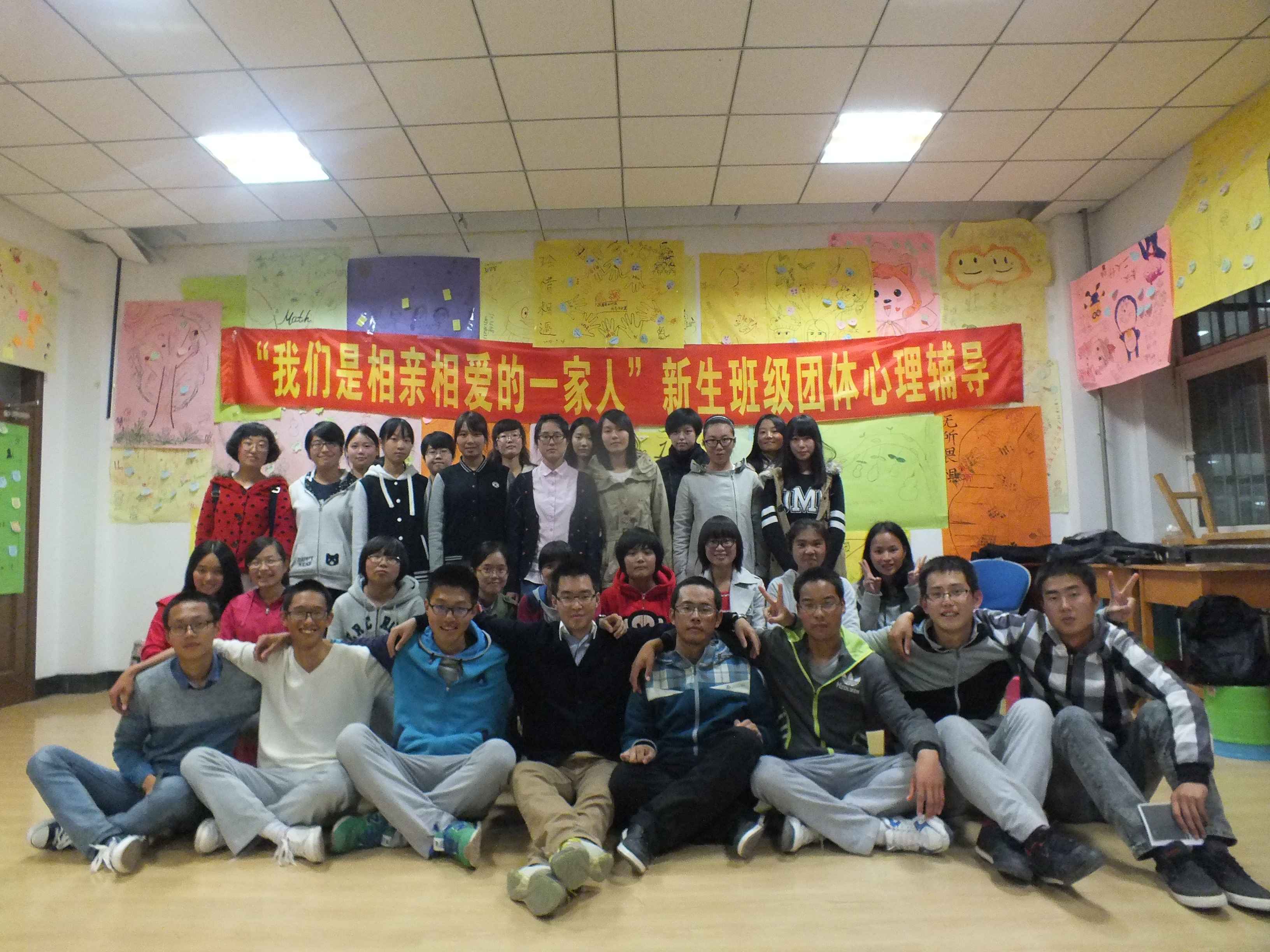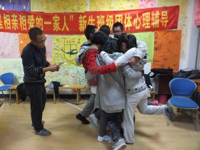 中心校区经信教学楼A101室举办了以“我们是相亲相爱的一家人”为主题的新生班级团体心理辅导。2014级新生代理班主任万辰光、彭丽端与081401班、081402班新生参加了此次活动,尹煜(2013级)同学担任了此次活动的主持。