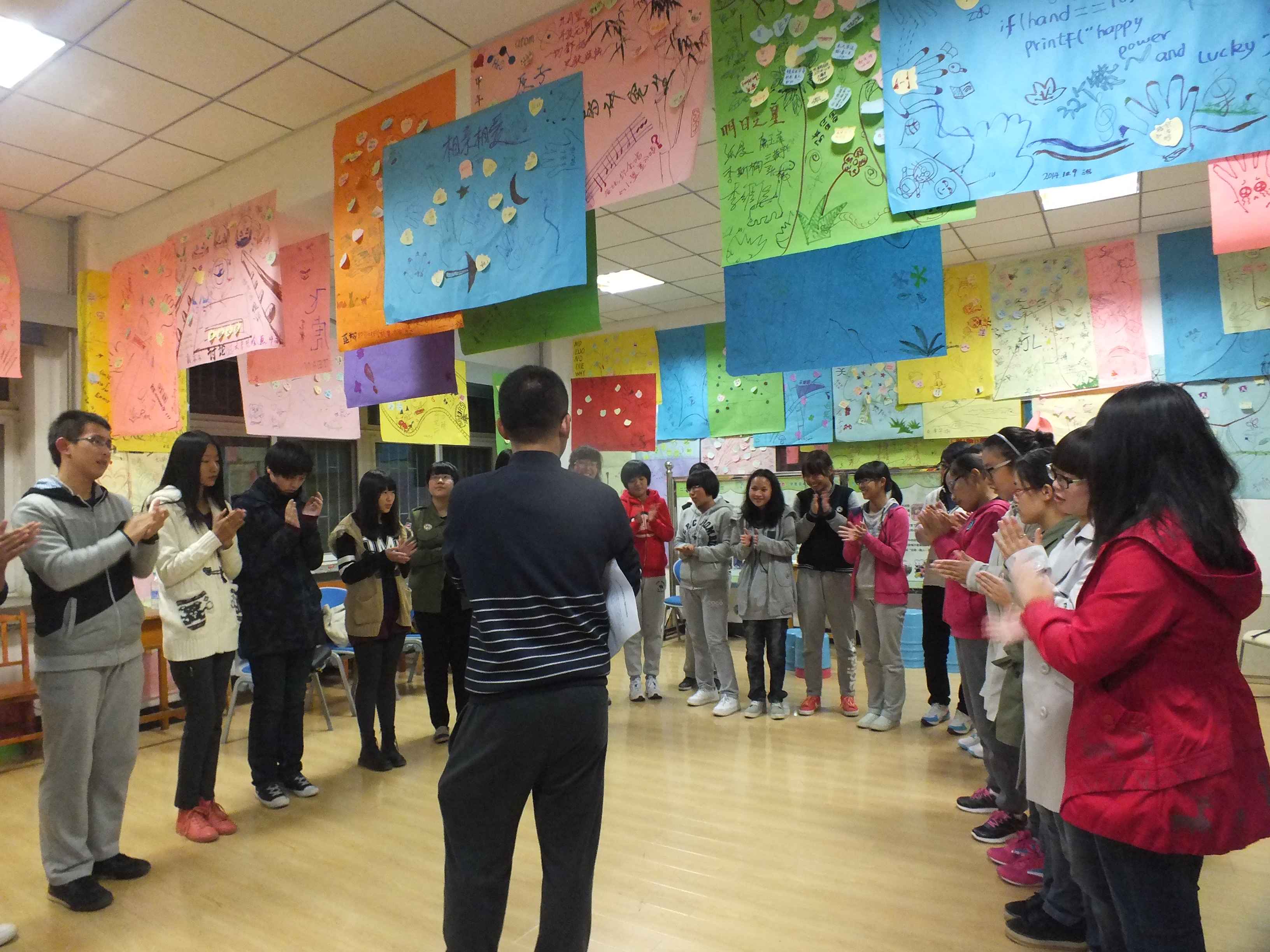 随着活动序幕的拉开,2014级新生进行自我介绍,独特的介绍方式令人耳目一新。接下来,两位代理班主任与新生们一起参加了“一分钟鼓掌”、“信任之旅”、“集体登陆”和“绘制团体树”四个游戏环节。在游戏中,新生们紧密配合,团结一致,共同完成游戏任务。新生们通过一系列的游戏,拉近了彼此间心与心的距离,也体会到了共同努力紧密相依的喜悦。在最后的“绘制团体树”游戏环节中,伴随着《相逢是首歌》的动人旋律,每个小组的成员齐心协力绘制《团体树》,《团体树》画出了新生们心中美好的祈愿,也画出了对彼此真挚的祝福。在整个游戏过程中,现场充满了欢声笑语,整次活动氛围轻松又温馨。