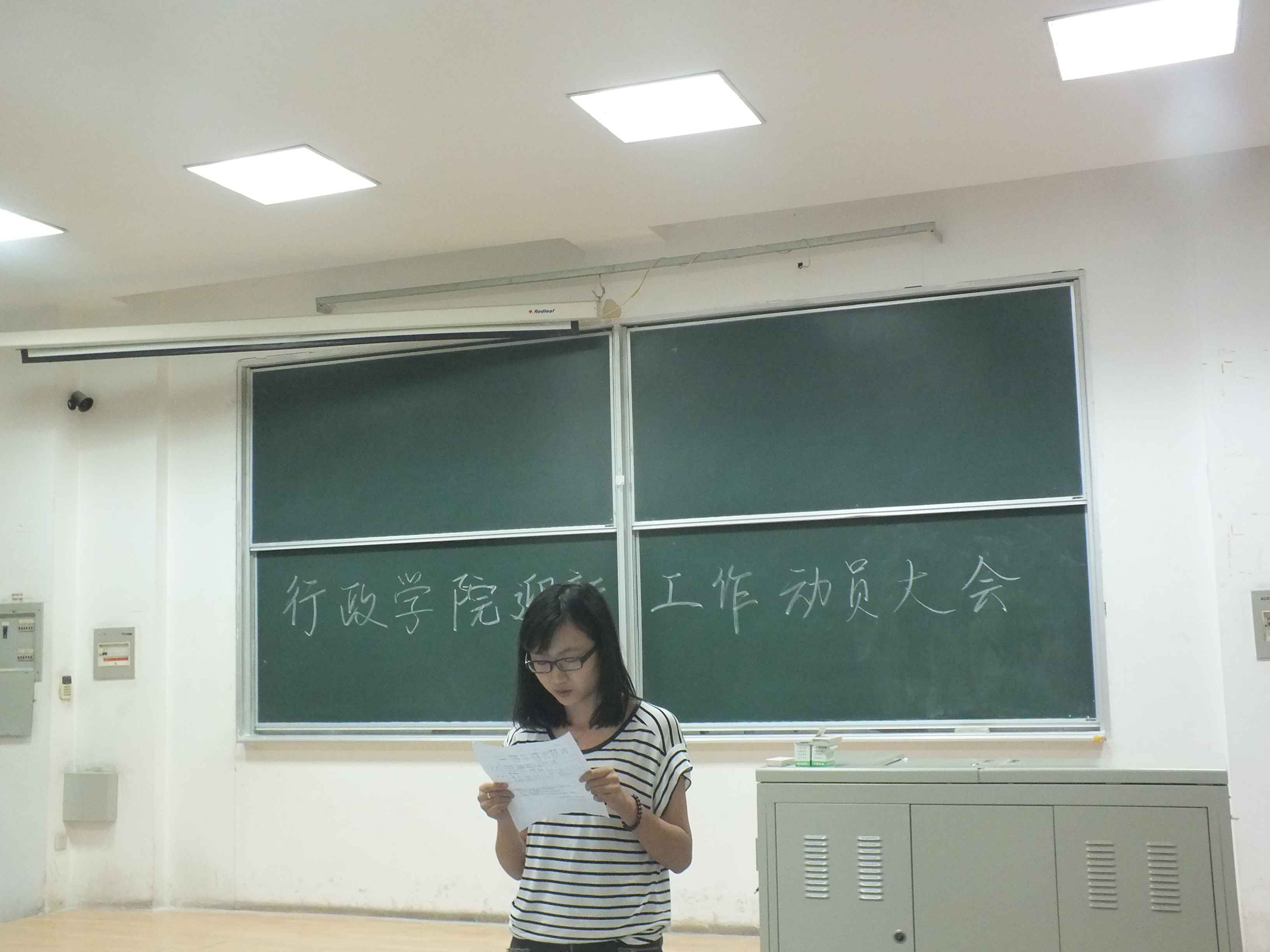会上,刘洋以有着特殊意义的六组数字为切入点,向同学们提出了迎新工作的总体要求。他提到,大家首先作为学长学姐,身上就肩负着一份责任;同时又作为学生干部,在收获师长同学关心与支持的同时更应该秉承“服务他人、收获成长”的理念,详细了解自身的工作任务,全身心地投入到迎新工作之中。他强调,面对新生,学生干部作为骨干力量,应当展现出行政学子良好的精神风貌,向新生展示积极、正面的形象。最后,他指出,迎新是一项长期持续的工作,他期望同学们能承担起自身的责任,给予新生长期的帮助与引导。之后,曲畅竹介绍了迎新工作人员的职责分工,对其着装、言谈举止等各个方面提出了具体要求,鼓励同学们通力合作并预祝迎新工作取得圆满成功。会议的最后,由学生会秘书长李沁妤(2012级)宣读迎新工作安排。