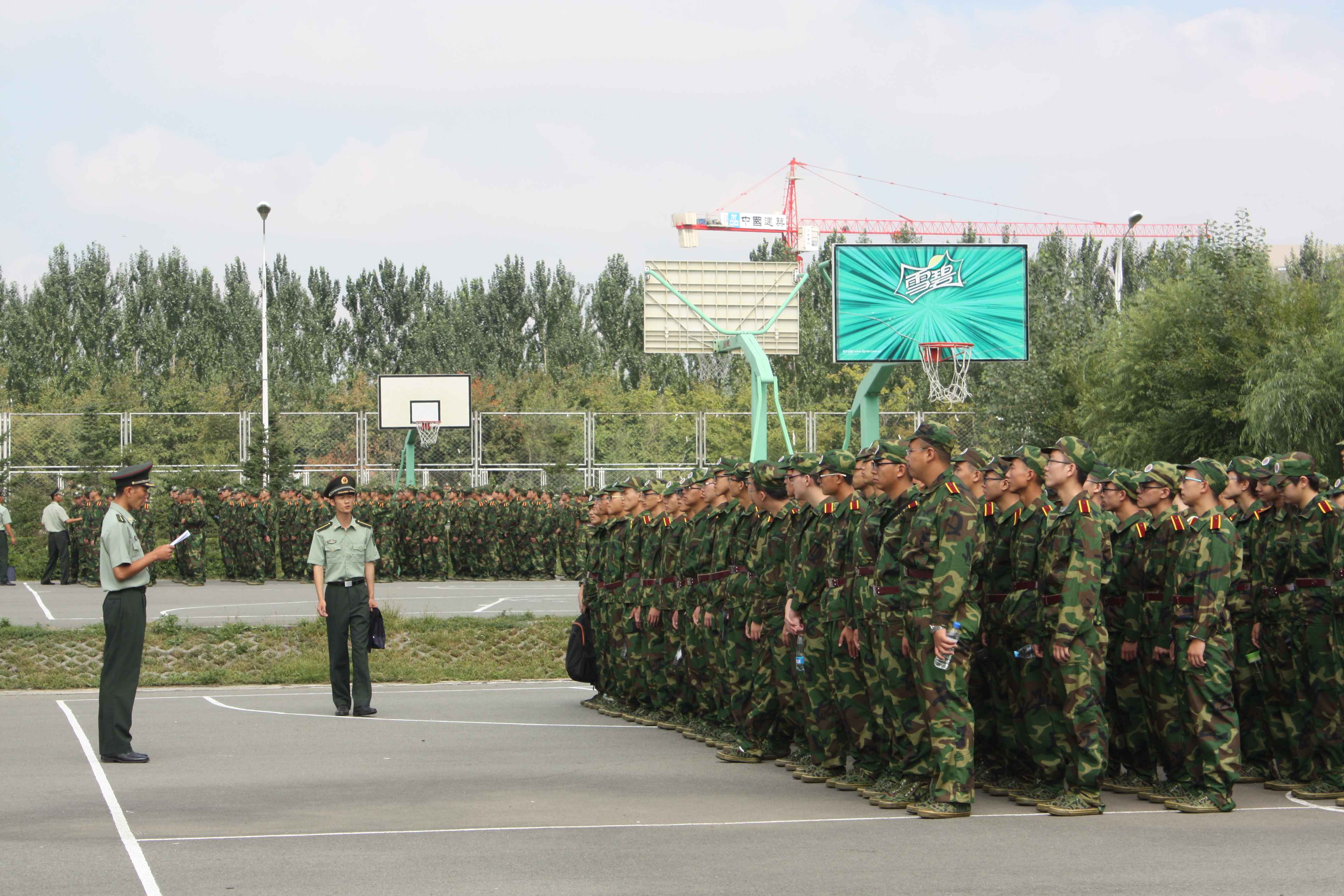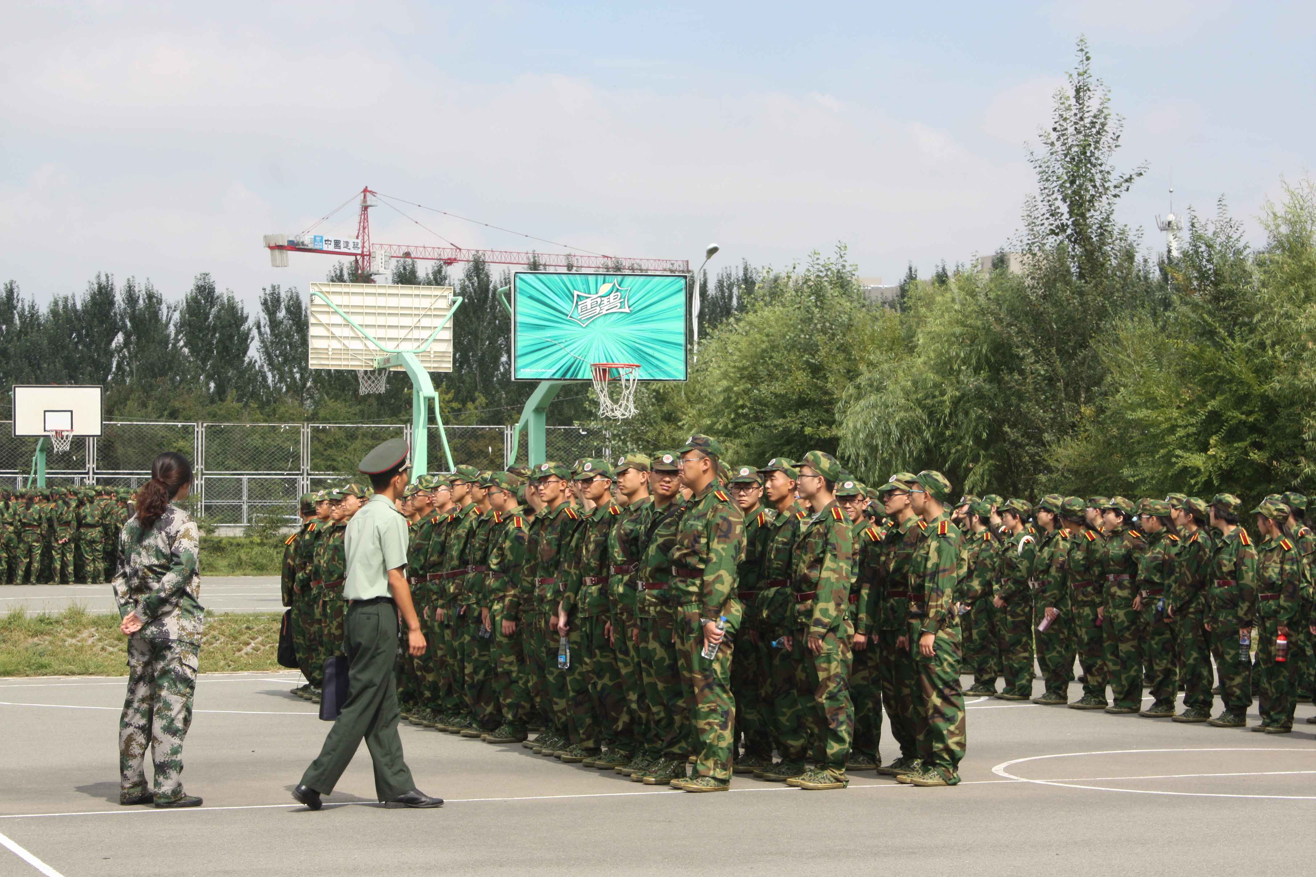 2014级新生被编在一营三连,新生在连长的带领下来到训练场地,随即投入紧张的军事训练之中。从站军姿到稍息,从跨立到踢正步,军事训练在教官的带领下有条不紊地进行着。万事开头难,尚未习惯高强度训练的同学们面对繁重的任务未免疲惫不堪。军训刚刚开始,动作尚显生疏散乱。但经过一个上午的团结努力,同学们的动作愈发标准,队列愈发整齐。不变的却是坚定的目光,蓬勃的朝气。