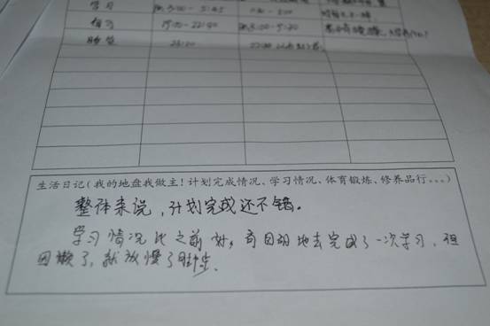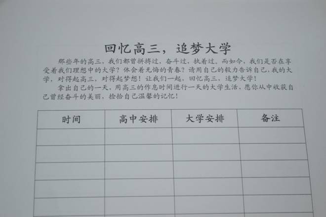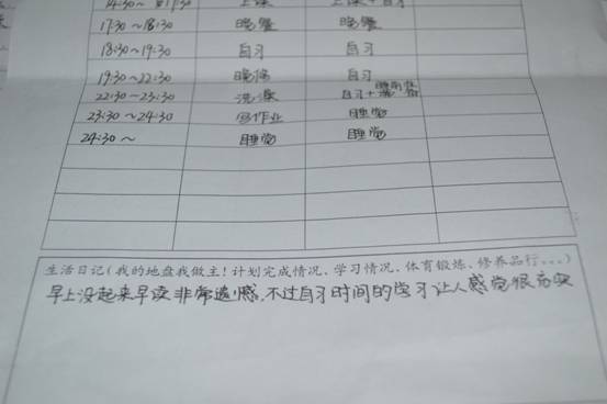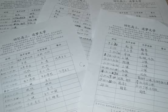 活动以作息时间表为载体,要求同学们用高三的作息时间安排一天的大学生活。12月5日,班委为同学们分发了作息时间表,并鼓励大家做好计划,用自己的毅力坚持一天紧张而充实的大学生活。12月6日晚,班委同学对同学们的计划完成情况进行了调查,并收集了部分同学的计划安排表。在调查过程中,一位同学说:“前些天,我越来越觉得我的大学生活对不起高三,这次活动我很认真的做了,一天过得比较充实。而且不断回想着自己高三的日子,想起了以前的老师和同学们,很怀旧,很幸福。”