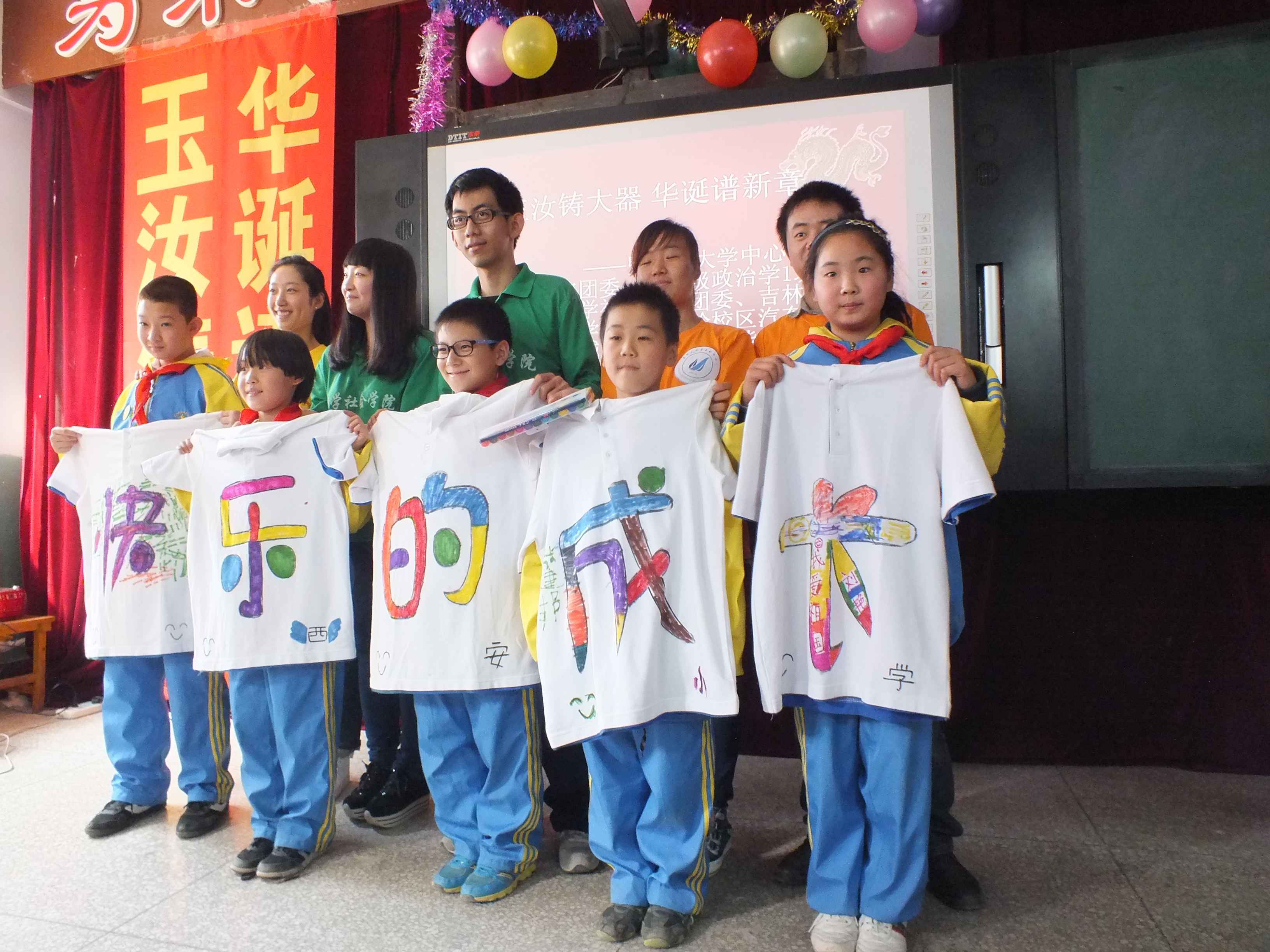 的志愿者们结合展现祖国建设发展的视频,带来了一段豪情满怀的爱国诗歌朗诵。在“活力互动”部分和游戏互动环节,小朋友们踊跃的参与到活动之中,为分别印有“快”、“乐”、“的”、“成”、“长”汉字图样的五件T恤衫亲手绘色。在现场绘色的同时,西安小学的陈思雨小朋友为大家表演了活力四射的拉丁舞。志愿者和小朋友们还和进行了“正话反说”、“抢凳子”等有趣的游戏。整场活动,小朋友们欢呼雀跃;掌声、欢笑声此起彼伏。
