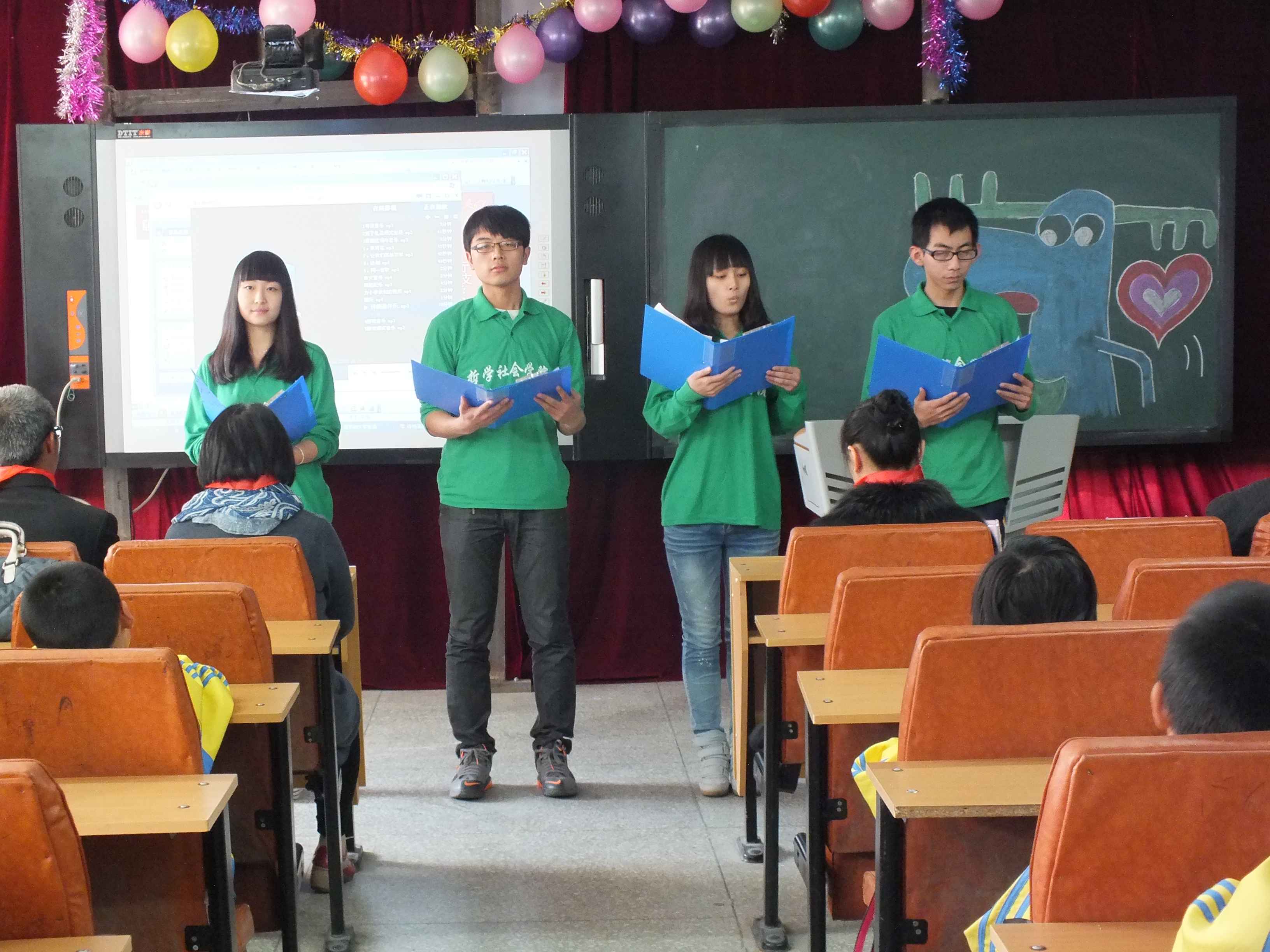 081201班的志愿者为小朋友们演唱了《让我们荡起双桨》、《送别》等校园歌曲,并结合幻灯片、视频,以情景剧的形式向小朋友们展示了极速赛车