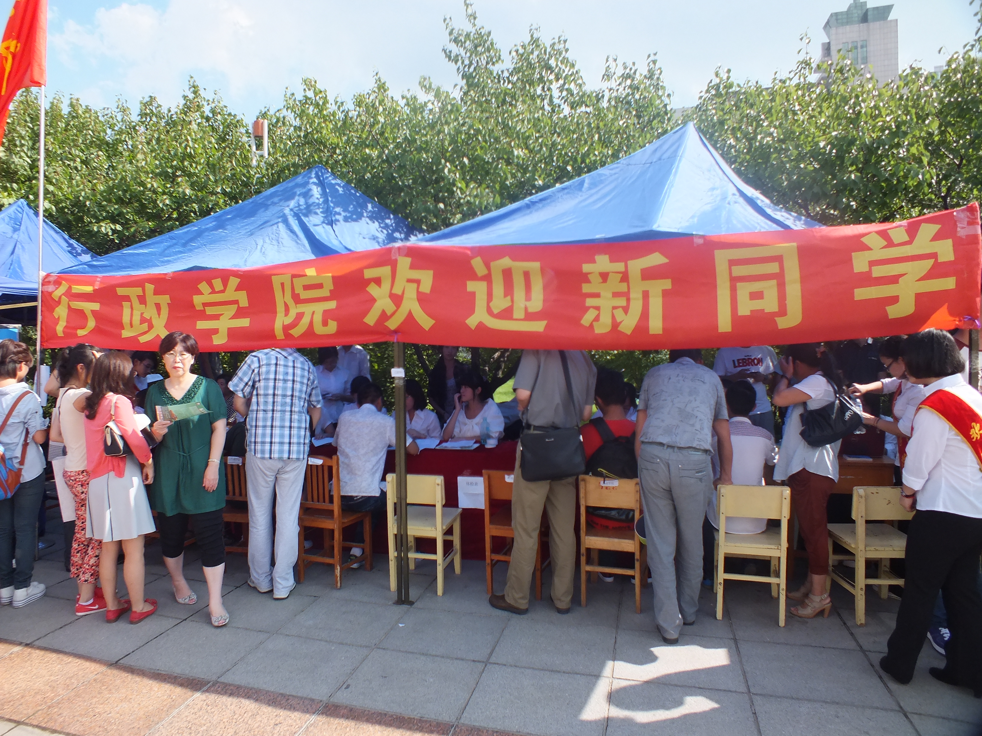 工作人员身着正装,佩戴团徽,充分展现了行政学子的精神面貌。他们在迎新点引导新生填写各类信息、办理入学手续,并为陪同等候的家长提供细致入微的服务。完成入学手续的办理,13级新生在志愿者的帮助与带领下去往寝室。为了减少新生和家长们的负担,志愿者们主动扛过沉重的行李,一趟趟的奔波于迎新点和学生公寓之间,挥洒着自己辛勤的汗水。