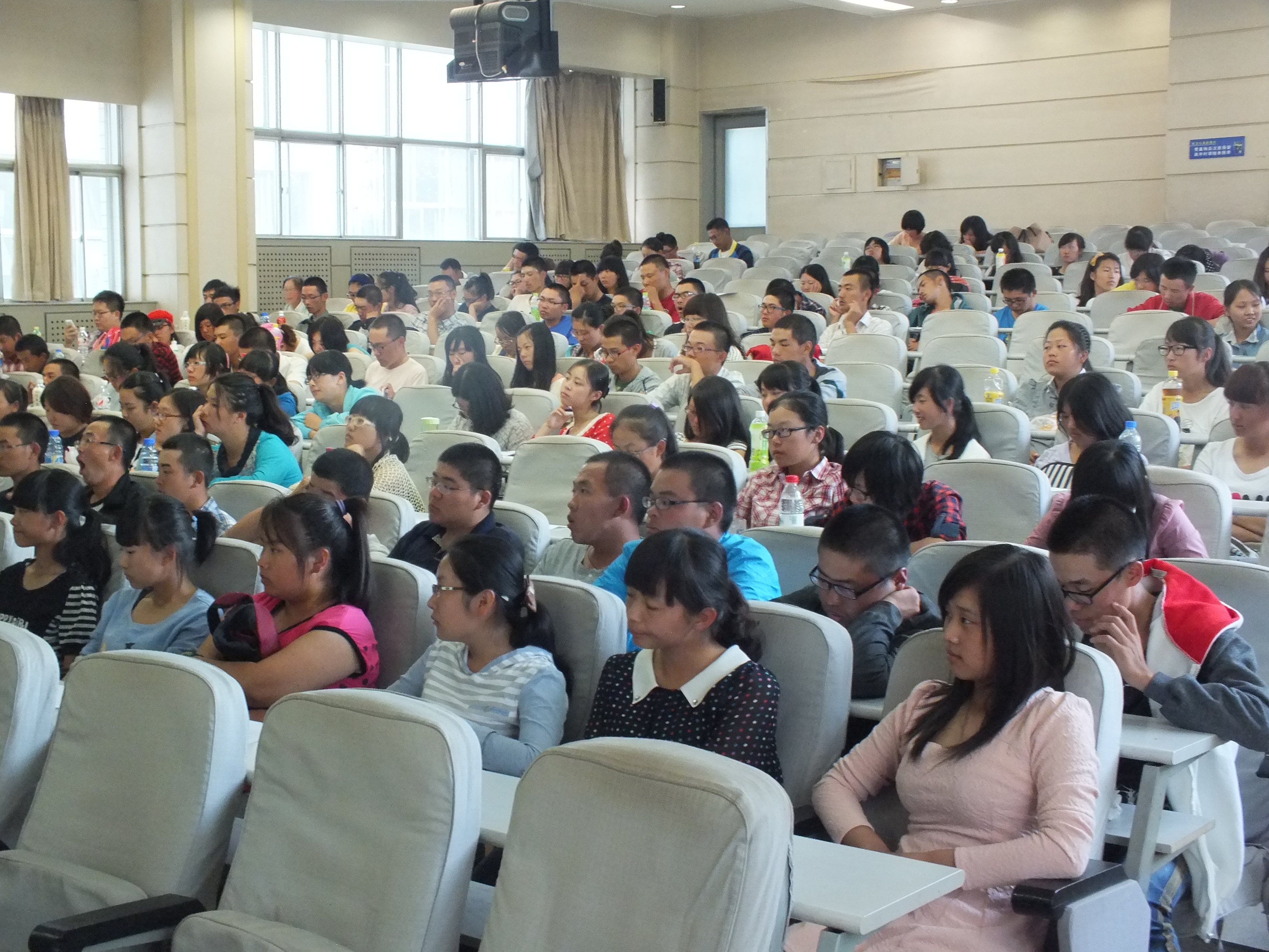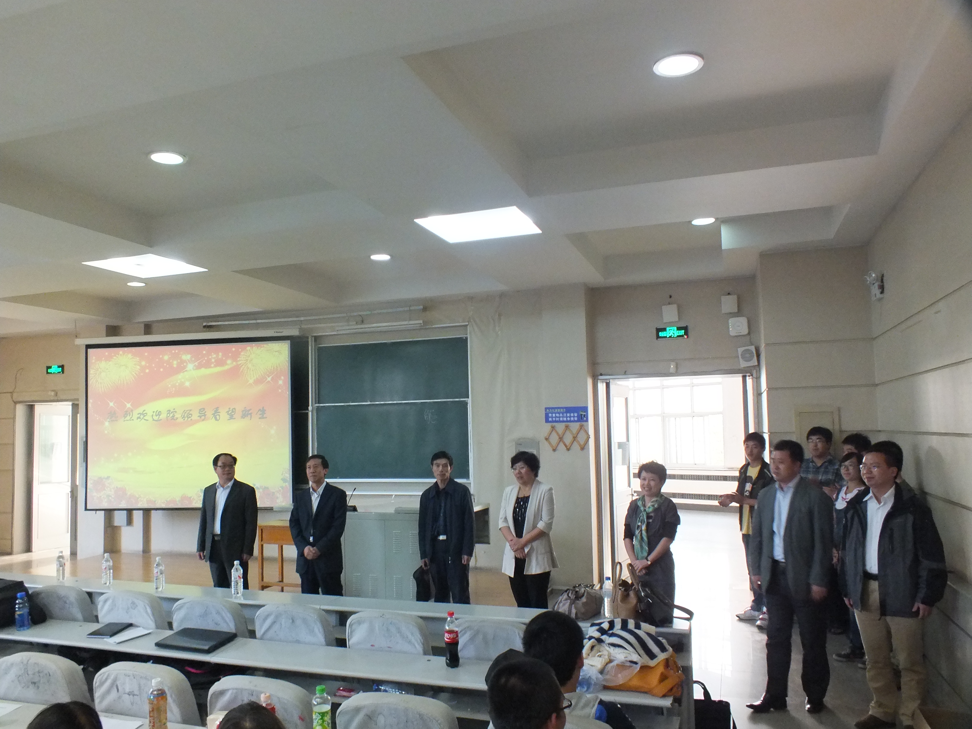 领导在本科生辅导员刘洋和助理辅导员吴兴识的陪同下来到逸夫教学楼第三阶梯教室看望刚刚参加过入学典礼的全体2013级新生。