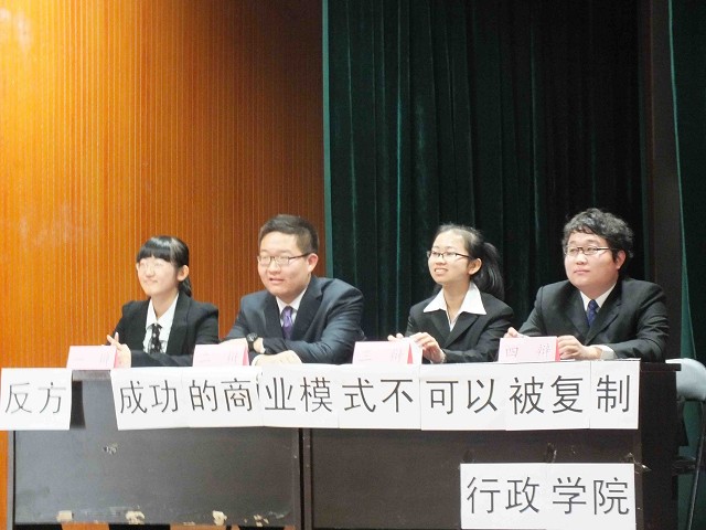 的辩论队伍就“成功的商业模式是否可以被复制”的辩题展开了激烈而又精彩的辩论。反方是由一辩范子雁、二辩寻累硕、三辩贾茹、四辩张冰组成的极速赛车