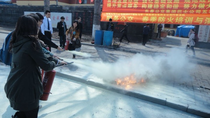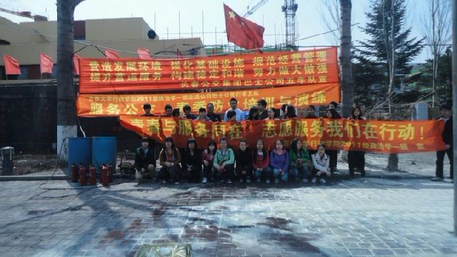 11级政治学一班全体同学于4月14日上午来到长春公交巴士公司行车五队进行防火培训与演练,并在公交上进行防火知识宣传。