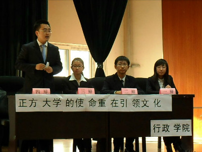 作为正方持“大学的使命重在引领文化”的观点。开篇立论阶段,我方从大学的理念与功能两方面论证了己方观点;反方则从现实层面出发,认为大学应该满足社会的需求、为社会提供智力支持。在紧张精彩的攻辩与自由辩论环节中,双方辩手唇枪舌剑,你来我往,以智慧的语言与敏锐的思维博得了评委及在场观众的热烈掌声,为大家献上了一场精彩的比赛。