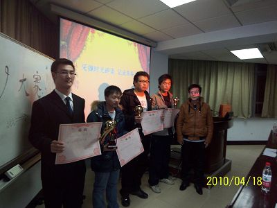 团委书记马景惠老师、团委副书记田治琛及团委各部部长出席了大赛并担任评委。大赛首先播放了开场短片,紧接着展播了09级四个班的参赛作品,分别是一班的《青春记忆》、二班的《王牌制片人》、三班的《情系西南》和四班的《坚强的心》。各班的作品以自身独特的风格、别具匠心的设计给在场的观众带去了快乐、感动和反思。接下来进行了一场配音游戏。游戏参赛者诙谐的表演增添了大赛轻松融洽的气氛。经过激烈的角逐,最终评出了四项团体奖 ——一班荣获最佳视觉效果奖 ,二班荣获最佳化妆(服装)奖,三班荣获最佳原创剧本奖,四班荣获最佳影片奖;六项个人奖—最佳男主角:刘洋,最佳女主角:洪桑桑,最佳男配角:王宏伟,最佳女配角:唐馨h,最佳导演:牟明标,最佳剪辑:李诗。最后,由团委副书记田治琛做最后总结。