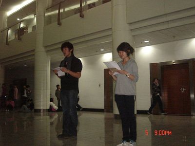 在彩排过程中,全体演职人员本着积极努力的态度,认真完成节目的预演,熟悉晚会基本流程,不断增强演员之间及演员与剧务之间的默契,以他们精彩的表现向老师和06级学生会成员汇报这一段时间以来的练习成果。同时,不同节目的演员之间也相互交流,彼此学习,不断改进和完善自己的节目。