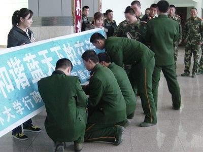 马老师代表全院师生,向长春武警第一支队赠送锦旗,为庆祝活动圆满成功,每位活动参与者都在活动条幅上签名并与友好单位合影留念。