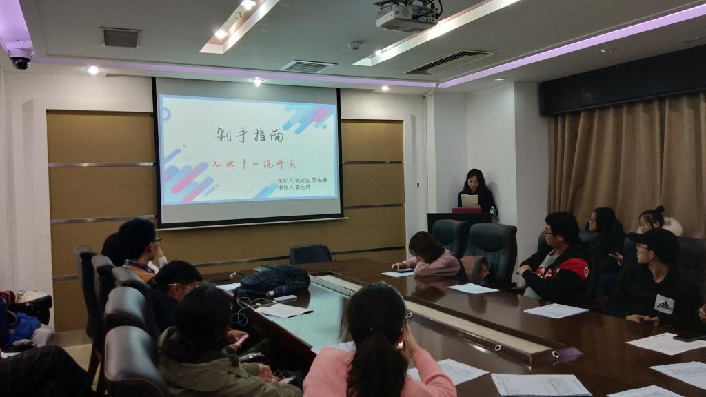 081805班于11月23日特举办“深度探索双十一风尚”团日活动,面向25名同学展开交流。此次团课在中心校区东荣大厦1214会议室召开,5班组织委员郭光婷担任此次活动的主持人。