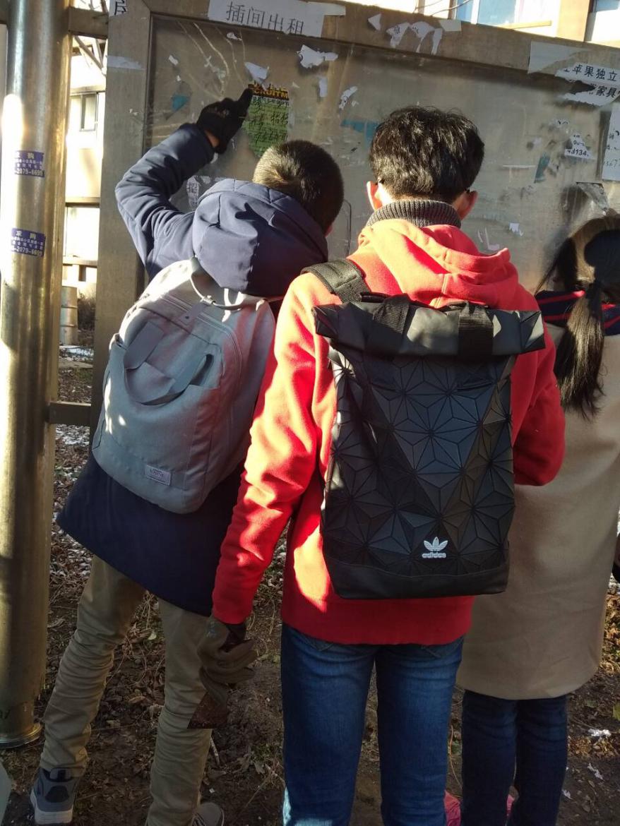 同学们到达后,富康社区党支部书记袁丽娟及社区的工作人员表示了热烈欢迎。随后,同学们在社区工作人员的带领下来到了小区的被贴满广告的公示栏前。大家齐心协力,不畏严寒,经过近两个小时的努力,公示栏被清理得干干净净。