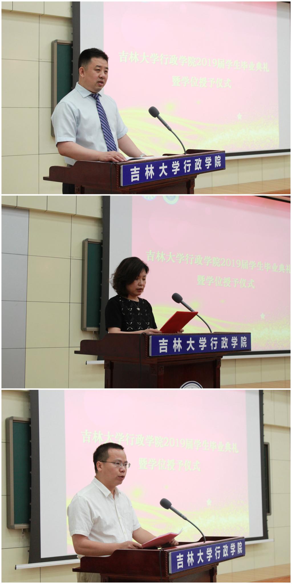 本科毕业生代表周金霖同学上台发言。他带着对于往昔的追忆进行大学生涯的回顾,娓娓道来自己的心路历程,他带着对于父母、老师、同学的感恩,憧憬美好的未来;研究生毕业生代表崔珊珊同学在发言中对多年来老师的职业指导与思维方式等多方面的教导,致以敬意和感谢。同时她希望通过最初的向往与目标来明确一种自我定位,通过自由意志、独立精神追寻实践的意义。她也祝福每个人不负吉大、不负期待。