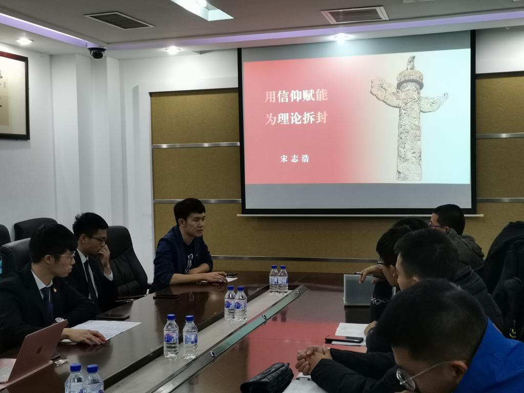 仪式伊始,宋志浩(2016级本科生)结合自己在全国政协的实习经历告诉学员们如何用信仰赋能、为理论拆封;王世亨(2017级本科生)向学员介绍了青年学习班的初心与学习内容,并结合自身经历讲述了如何做一个有觉悟的社会主义事业的建设者;朱鸿(2018级本科生)通过对党的十九届四中全会政策的解读带领大家学习党的十九届四中全会精神;王馨瑶(2018级本科生)从“求实思源、服务社会”计划的实践经验中阐述了青年人应有的使命与担当。认真聆听完四位的分享之后,学员们纷纷表示受益匪浅。接着,学习班成员们以被授予团徽、共同宣读入团誓词的形式重温入团仪式。最后,宋志浩和王世亨向学习班的新学员们赠送《习近平新时代中国特色社会主义思想三十讲》,激励学员们不断学习先进思想、锐意进取。