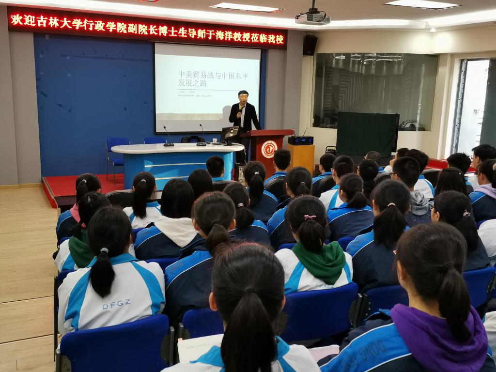 一行来到湖北省重点中学东风高级中学。首先,于海洋教授在报告厅为100余名高三文科生做了题为“百年未有之大变局:中美贸易战与中国和平发展之路”的专场学术报告。随后,进行了“极速赛车