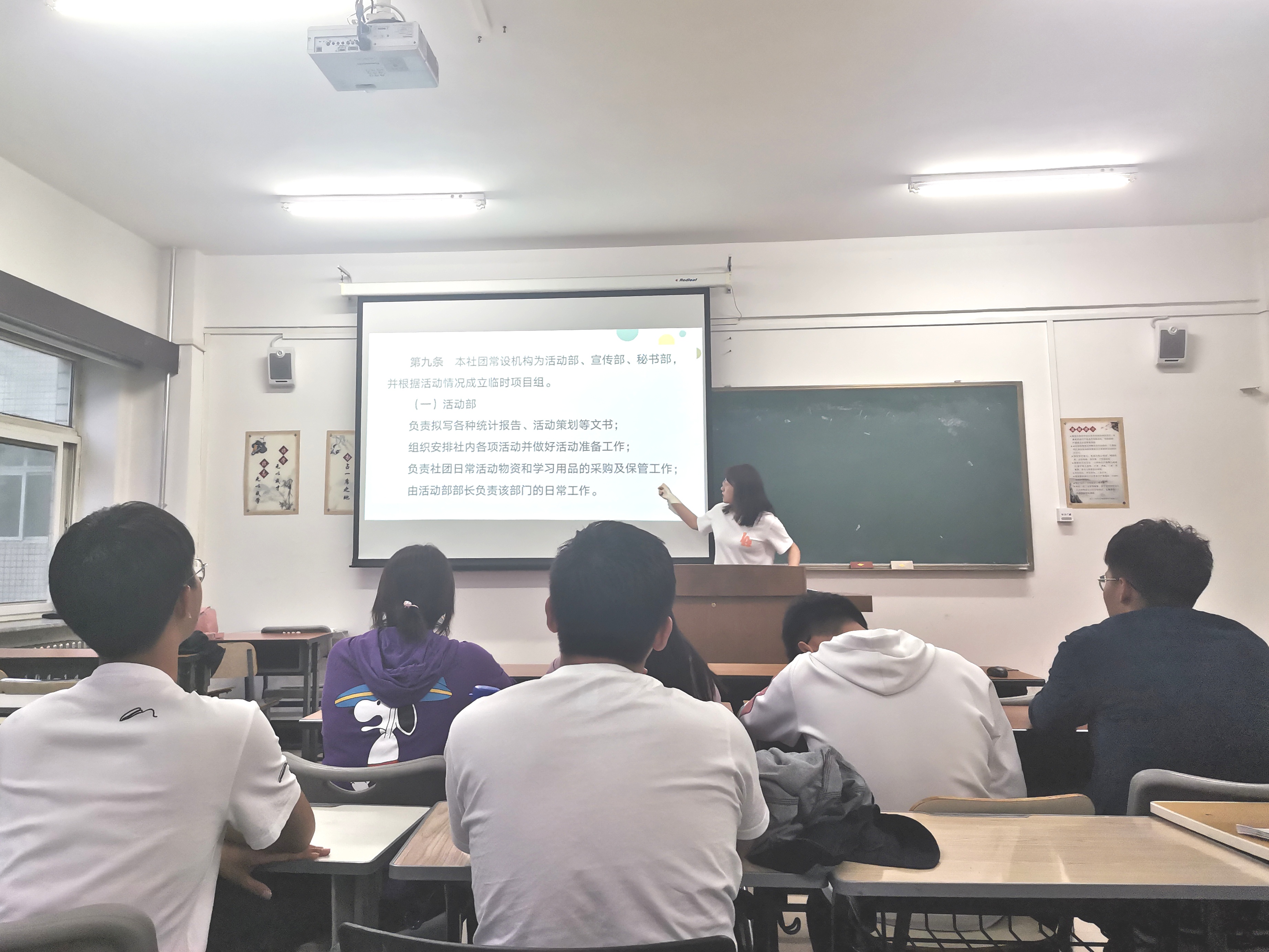 5月14日18:30活动准时开始。首先,社团负责人赵蕊(2019级本科生)向成员们分享了社团的相关情况。随后,活动部负责人周相妍、宣传部负责人吴楠、秘书部负责人刘子杰分别对各部门职能以及各项技术操作、工作中的注意事项进行了讲解,进一步提升了志愿者的服务能力,强化了志愿者的服务意识。最后,各部门负责人分别解答了志愿者们关于社团工作的疑问,赵蕊同学介绍了下一阶段社团活动安排及发展方向。活动在大家的掌声中圆满结束。