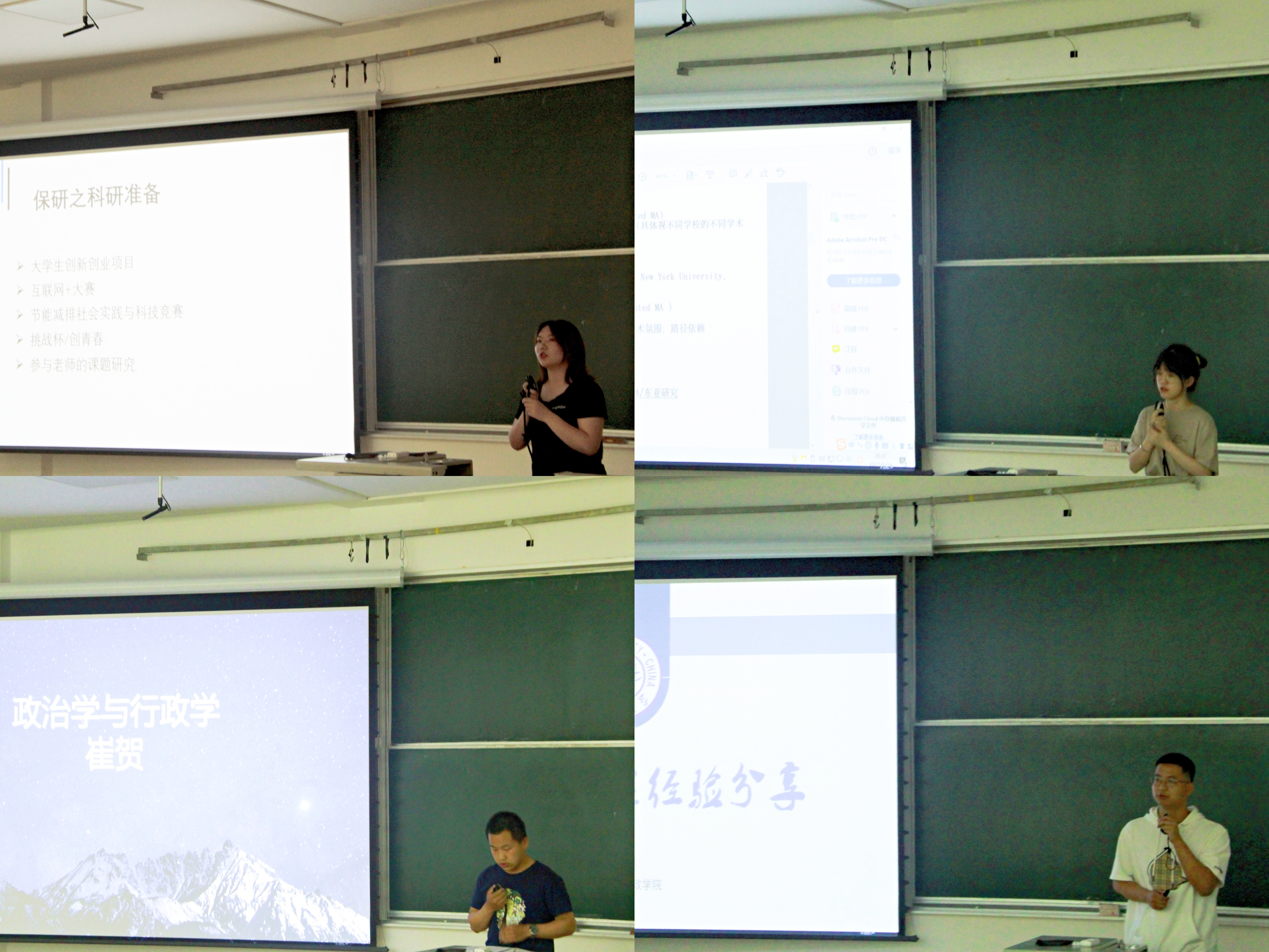 之后,“海外追梦组”刘劼涵同学介绍了一些本专业相关的海外项目及申请经验。“基层建功组”崔贺同学详细介绍了选调生相关政策与考录流程。吕彦忠同学介绍了报考选调生所需的笔试面试相关材料与查找途径。“职场逐梦组”刘智宇同学介绍了应聘前、中、后不同阶段所要做的准备。高鹏鸿同学分享了自己在简历制作、笔试面试等方面的有益经验。