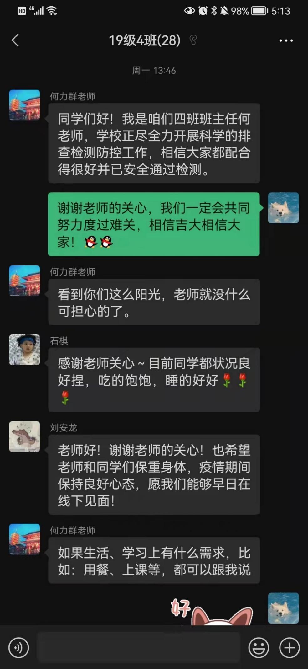 反映;接下来,老师在班级微信群内就学习、生活、心理状况等方面与同学们进行了深入的沟通,并表达了对大家的深切关心与期望;同学们在微信群里积极回应老师,班会气氛活跃。