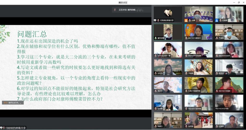 2021级二班班会由罗舒连同学主持,苏一展同学以轻快的歌舞展示作为开场,缓解了同学们的紧张情绪。随后志愿者同学分享了自己的抗疫故事,讲述了在志愿服务工作中的所见所闻,表达了身为志愿者的自豪。班会中,班主任刘畅老师对同学们积极乐观的心态表示赞许,并通过分享自己在“非典”时期的经历,叮嘱同学们做好时间管和生活管理,在抗击疫情的学习和生活中不断成长。班主任许宁老师则针对同学们提出的各种问题做出指导,强调要不断坚实巩固理论基础,培养系统成熟思维体系,加强学术积累,把握重要机遇。最后,老师们收集了同学们在饮食、就医等方面的问题,并表示会向极速赛车