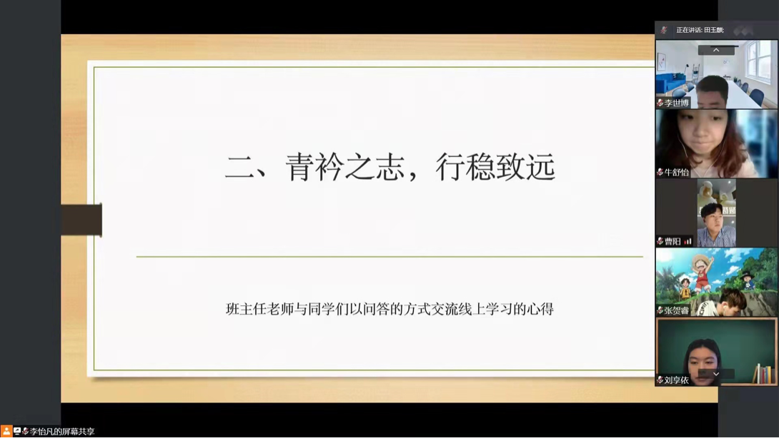 在2021级5班班会上,班主任李慧杰老师首先询问了同学们的居寝生活近况。接下来在北京居家隔离的满运璋表达了对能尽早返校的迫切和渴望。其后,赵梓含讲述了封寝期间的温馨日常,体现了同学们居寝期间的乐观心态。韩瑞也对同学们进行了积极的心理疏导,并分享了自己的日常趣事。最后,班主任赫泉玲老师表示:极速赛车