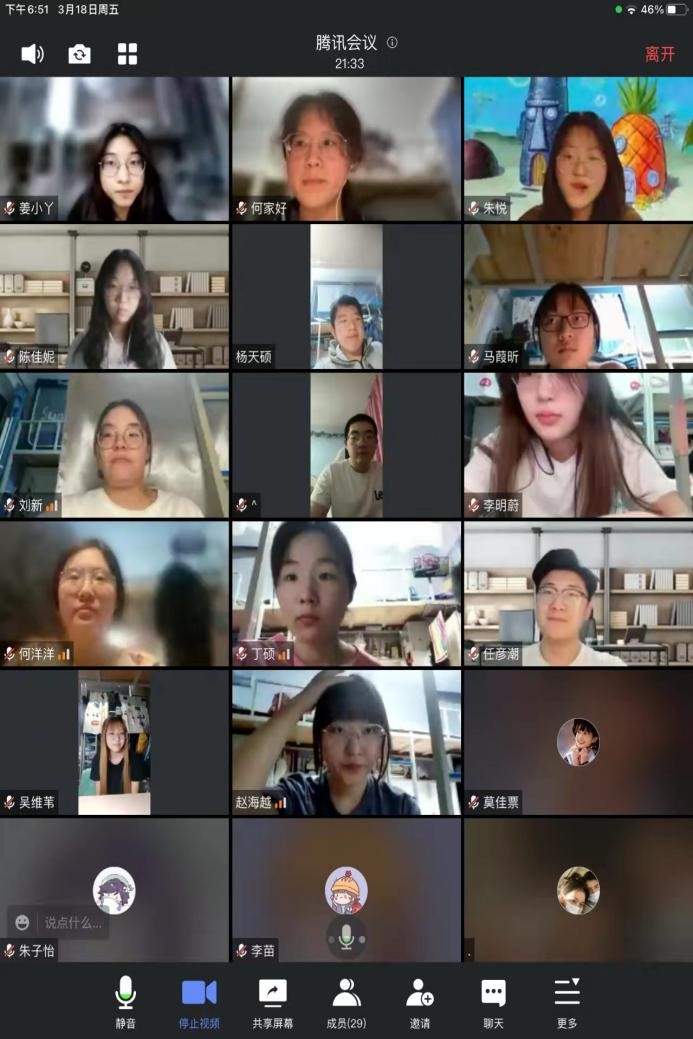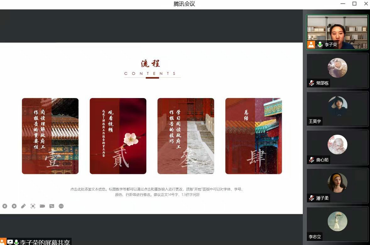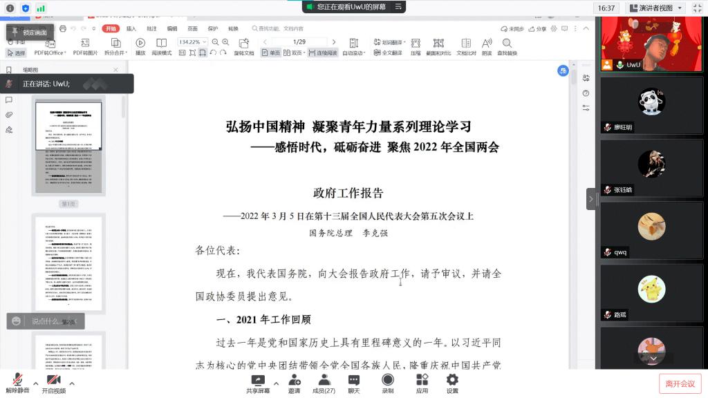 本次团日活动于线上展开,各团支部通过报告解读、视频观看、感悟分享三个环节全面、深入地学习政府工作报告。在报告解读环节,各班团支书就2021年工作回顾、2022年经济社会发展总体要求和政策取向以及2022年政府工作任务三个方面,带领同学们解读报告内容、领悟全会精神。在视频观看环节,同学们了解到近几年我国抗疫工作取得的成就,体悟到中国脱贫攻坚、全面建设小康社会的艰辛与不易,加深了对社会主义制度优势的理解。在感悟分享环节,杜艺轩(2020级本科生)表示,我们要更加紧密地团结在以习近平同志为核心的党中央周围,高举中国特色社会主义伟大旗帜,攻坚克难,砥砺奋进,以实际行动迎接党的二十大胜利召开。朱悦(2020级本科生)则联系当下疫情防控的现状,结合两会中总结的2021年疫情防控经验成果,呼吁同学们坚定信念,携手并肩,共克时艰。