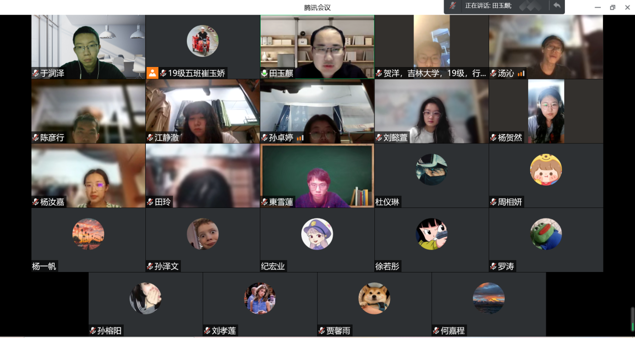 举办的学术征文比赛并鼓励同学们积极参加。随后,田老师与贺洋、刘懿萱、罗涛等十名同学互动,询问同学们现阶段的学习状况与学业规划,为一些存在困惑的同学提供建议,传授查找文献的经验。最后,田老师勉励同学们保持定力,维持良好的身体、心理和学习状态。