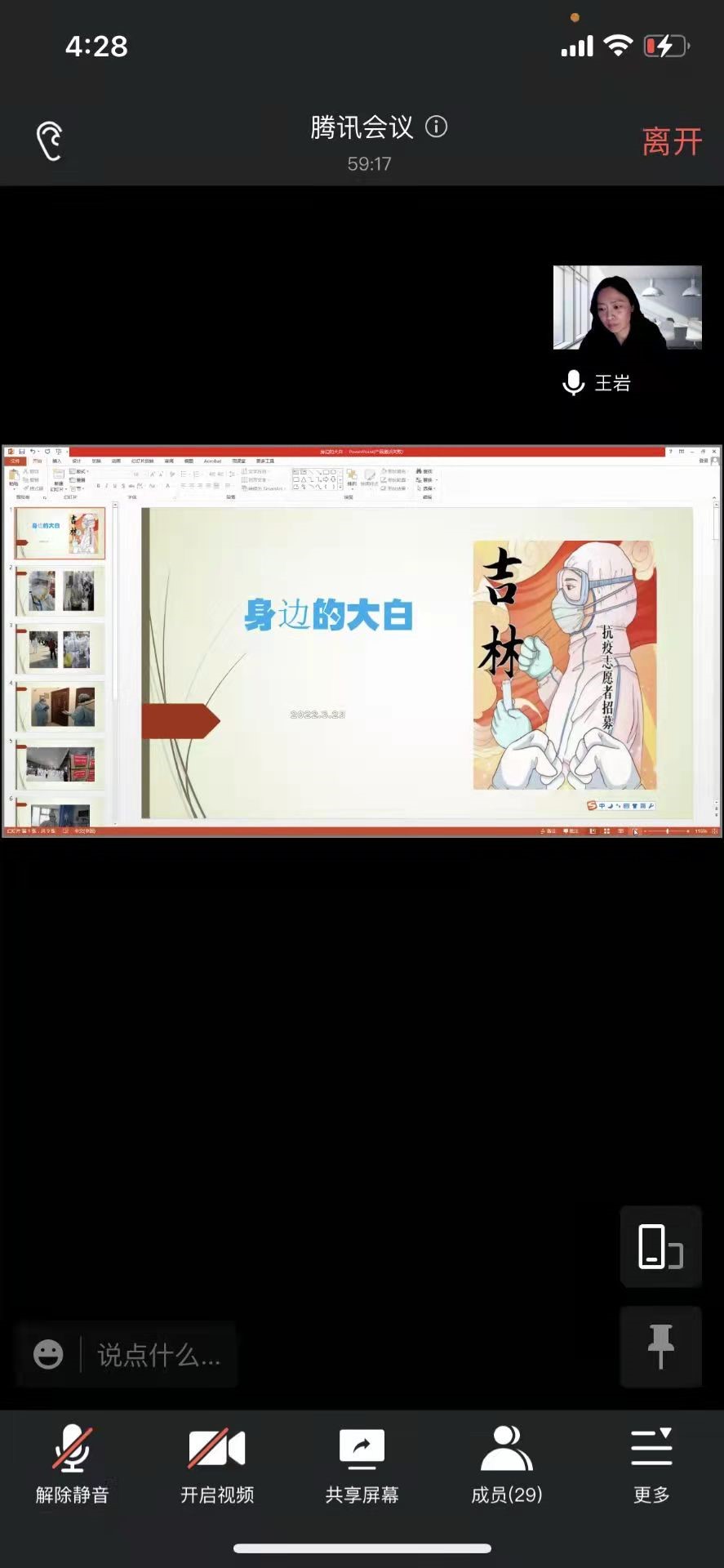 3月23日,在2021级三班的班会上,郭锐老师、王岩老师与同学们进行线上见面交流。首先,谭家琦、张梦涵、张仁楷、郭凡、刘祉含五位同学分享了自己的居寝日常生活和这段特殊时期的感悟。郭锐老师建议同学们充分利用这段时间多读书多提升自己,并向同学们推荐了自己所喜欢的电视剧;王岩老师通过PPT分享了在抗议一线进行志愿服务的亲朋好友的照片,以及自己的居家日常生活。分享过程中,两位老师都对同学们表达了关心。最后,胡梓烁同学提出了几点防疫注意事项,提醒大家防疫勿当儿戏,敦促同学们端正防疫态度、强化防疫观念。