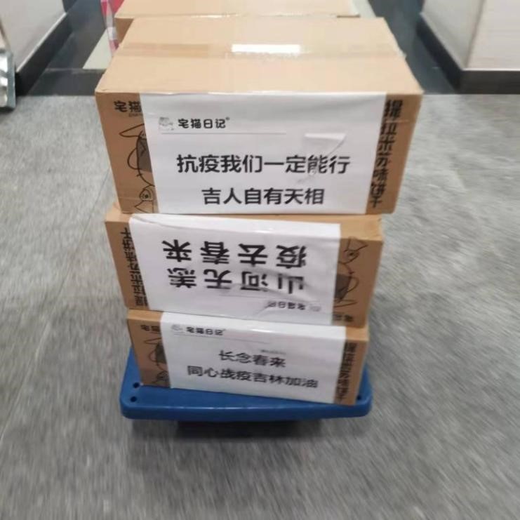 校友捐赠的食品到达公寓,志愿者们同样快速下楼集合,搬运分发物资。“抗疫我们一定能行”“吉人自有天相”“山河无恙,疫去春来”“长念春来,同心战疫吉林加油”——包装箱上的话语饱含美好祝愿,暖流跨越山海,此情地久天长。