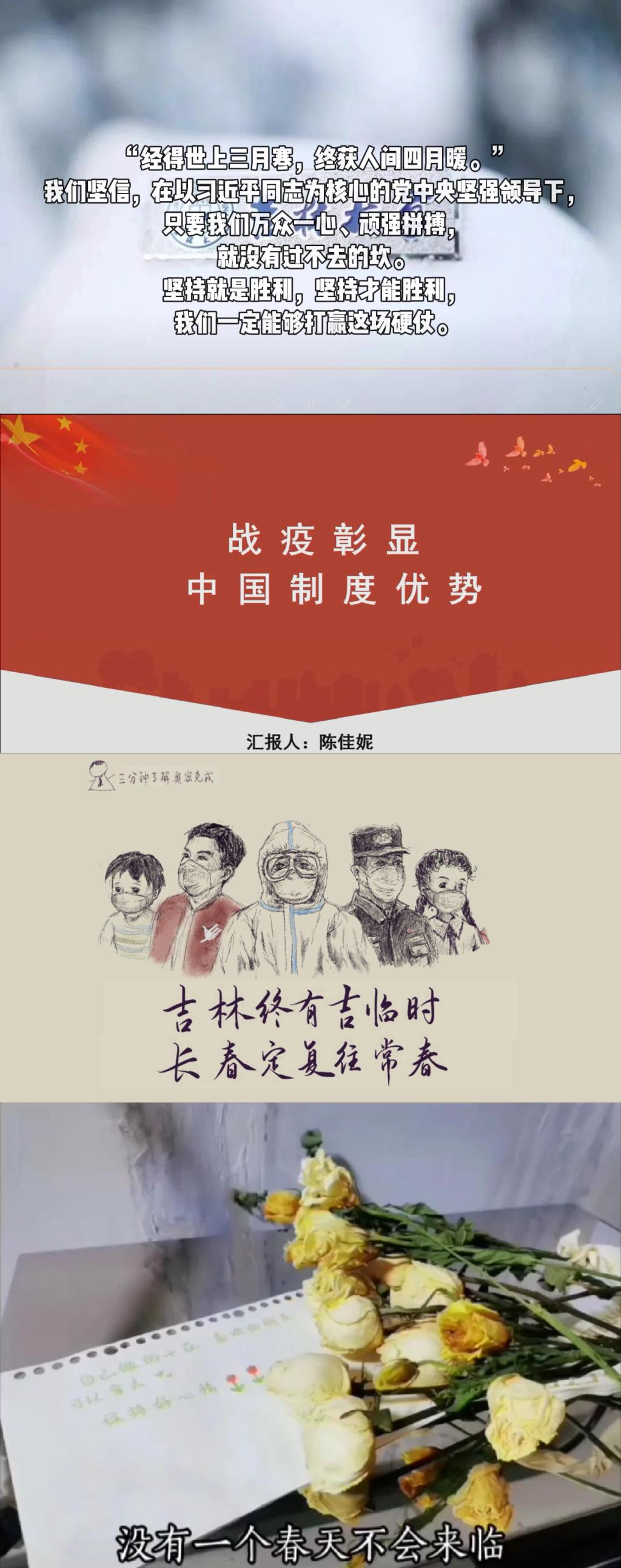 11份立项作品内容丰富、形式多样,展现着行政学子独特的专业风采。《抗疫斗争彰显中国力量》《三分钟了解奥密克戎》等思政微课程作品分析了战“疫”中体现的中国制度优势,向同学们科普防疫知识,传递抗疫必胜的信念;《吉人记》《防疫手势舞》《抗疫精神的绽放》等文艺微视频以音抒正声,借舞传真情,展现了感人肺腑的抗疫事迹,表达了携手共度难关的决心和共盼春来的美好愿望;学术微分享类别中,《对口支援之思》围绕周光辉教授的论文赏析展开,结合吉林战“疫”的实践,简要介绍了“对口支援”——应对社会重大突发性事件的有力工具,体现同学们扎实的专业素养。