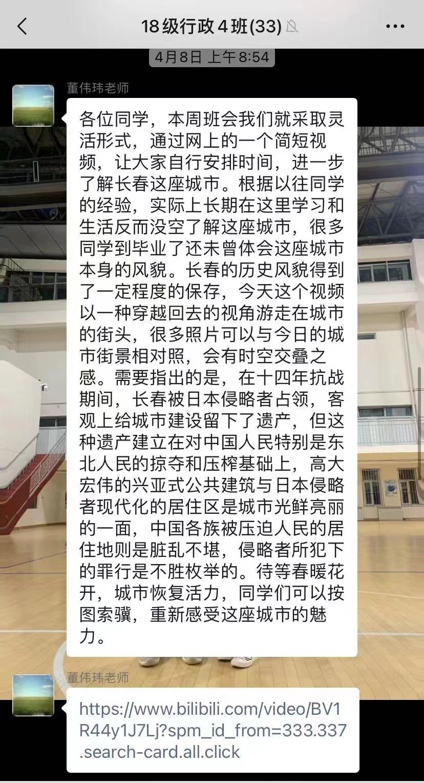 班会采取灵活的形式,董伟玮老师通过网上的一个简短视频,让大家进一步了解长春这座城市。这个视频以一种穿越时间的视角让同学们游走在城市的街头,过去与今日的城市街景相对照,产生时空交叠之感。董老师指出,在十四年抗战期间,长春被日本侵略者占领,客观上给城市建设留下了遗产,但这种遗产是建立在对中国人民特别是东北人民的掠夺和压榨基础上的,高大宏伟的兴亚式公共建筑与日本侵略者现代化的居住区是城市光鲜亮丽的一面,而中国各族被压迫人民的居住地则是脏乱不堪,侵略者所犯下的罪行是不胜枚举的。此外,老师还建议同学们等到春暖花开,城市恢复活力之时,同学们可以重新感受这座城市的魅力。会后,同学们纷纷表示通过视频的观看,自身对长春这座城市的文化有了更为深刻的了解。