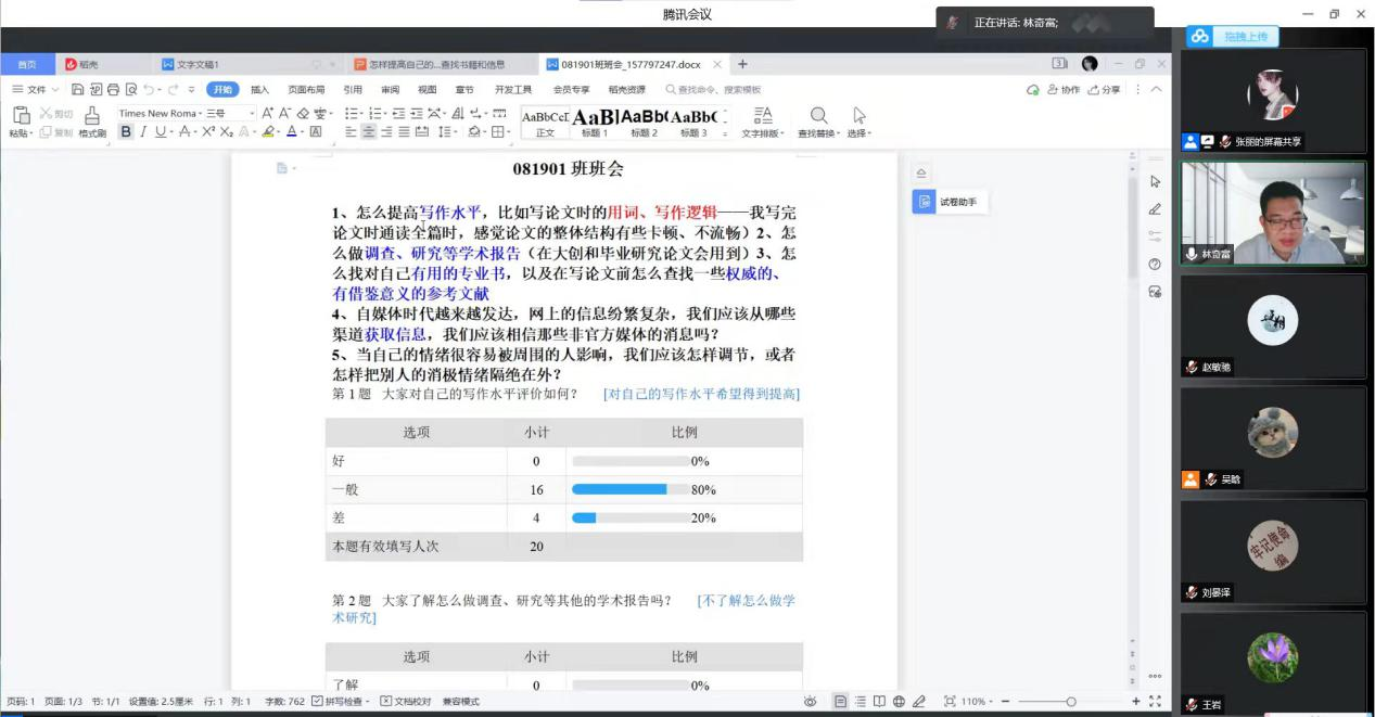 4月8日下午,2019级一班召开了本学期第四次线上班会,班主任林奇富老师、王岩老师和28名同学参加会议。张丽同学主持会议,介绍班级同学前期问卷调查结果,用数据向同学们展示班级同学写作能力的评估以及对有效查阅信息和数据的掌握程度。随后,张丽同学结合自身情况以及疫情防控政策向同学们进行讲解,同时进行志愿者活动的宣传和倡导。在老师解答问题环节,林奇富老师首先解答同学们事先提出的问题,分享如何提升自身写作水平的经验以及做研究与调查的步骤、方式。王岩老师也针对论文写作、如何捋顺论文逻辑等问题进行补充,也就如何看待网络媒体等问题与同学们分享了自己的一些想法和建议。