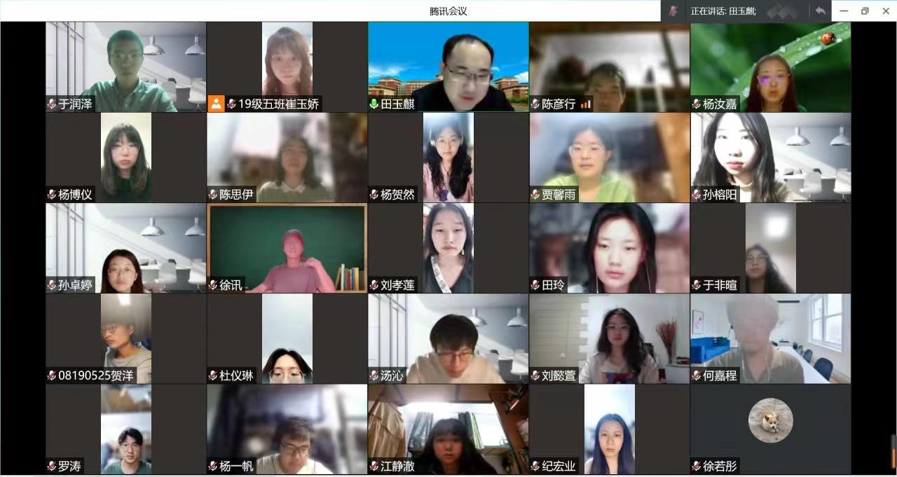 安排。随后,田老师与刘孝莲、陈思伊、杨一帆、江静澈等8名同学互动,询问同学们现阶段的学习状况、学业规划和就业规划,为同学们提供了宝贵建议。田老师统计了全班同学的未来规划情况,勉励同学们相互帮助,互相鼓励,完成自己学业目标。最后,田老师认真回答了陈彦行同学提出的问题,并关心了这段时间其他同学的相关进展情况,鼓励同学们利用好未来的时间,充实自己最后的大学本科生活。