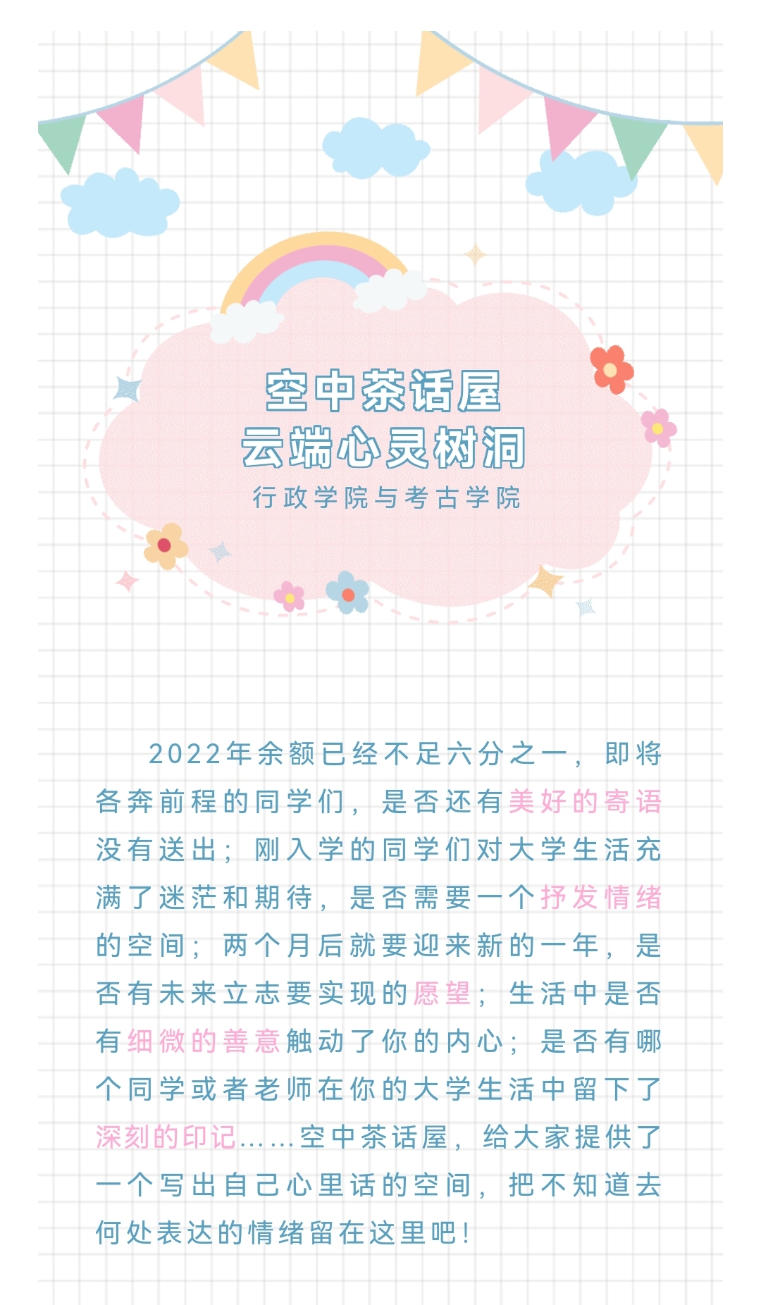 联合开展了“空中茶话屋——云端心灵树洞”活动。此次活动以共享文档为载体,通过在文档中记录生活故事、分享生活体会的方式,拉近了同学们之间的距离,营造了良好的校园交友氛围,同时为同学们留下了一份珍贵而美好的大学回忆。