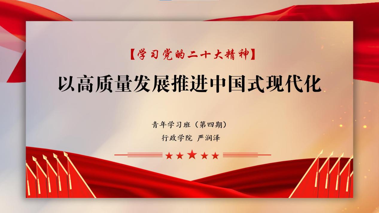青年学习班(第四期)开班一年来学习情况。从理论学习到实践拓展,青年学习班在遵循疫情防控的前提下举办了多项活动,成员们在这一年中收获满满、进步非凡。随后,学习班学员代表严润泽同学带领全体成员学习党的二十大精神。他对党的二十大报告的重点内容作出概括,强调坚持党的全面领导是党和国家的根本所在、命脉所在,是全国各族人民的利益所在、幸福所在,是实现中华民族伟大复兴中国梦的根本保证。接下来,由学习班代表小组进行学习成果展示,他们以短视频的方式展现了青年学习班一年来的感人瞬间,记录下成员们成长的蜕变。展示环节结束后,青年学习班(第四期)优秀学员代表叶兆东、黄琴两位同学分别发表了结业感言,分享了这一年来他们在学习班的心得体会。